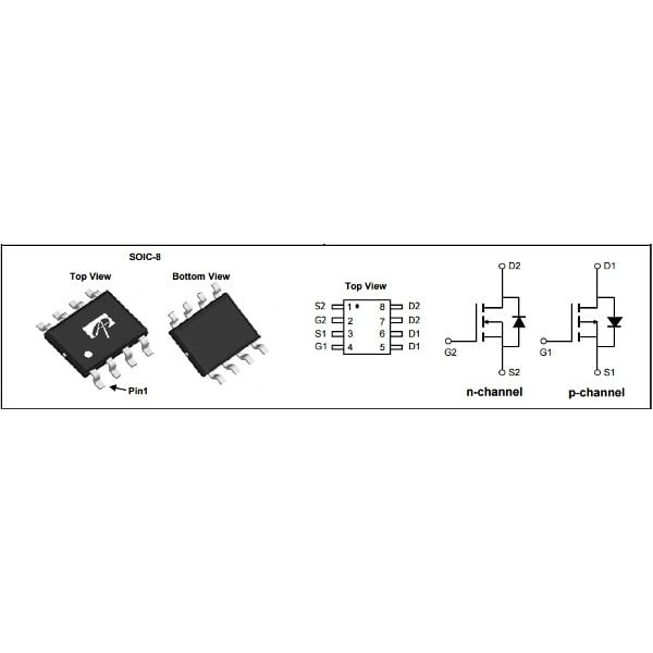 30V Complementary MOSFETN-ChannelVDS=30VID=6A @ VGS=10VP-ChannelVDS=-30VID=-6.5A @ VGS=-10VThe AO4606 uses advanced trench technology MOSFETs to provide excellent RDS(ON) and low gate charge. The complementary MOSFETs may be used to form a level shifted high side switch, and for a host of other applications.