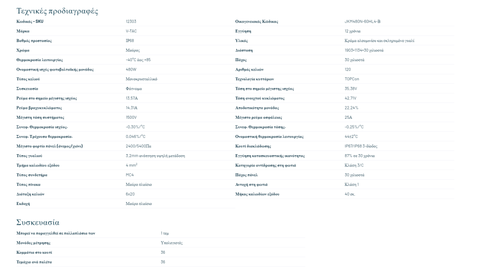 Το V-TAC SKU 12303 είναι ένα μονοκρυσταλλικό φωτοβολταϊκό πλαίσιο 480W Black Frame Tier-1, που ανήκει στη σειρά Tiger Neo της Jinko Solar (JKM480N-60HL4-V), σχεδιασμένο να προσφέρει εξαιρετική απόδοση σε οποιαδήποτε περιβαλλοντική κατάσταση. Διαστάσεις 1903x1134x30mm και πυκνότητα ισχύος 222W/m² το καθιστούν ιδανικό για οικιακές, εμπορικές και βιομηχανικές φωτοβολταϊκές εγκαταστάσεις, βελτιστοποιώντας τον διαθέσιμο χώρο.