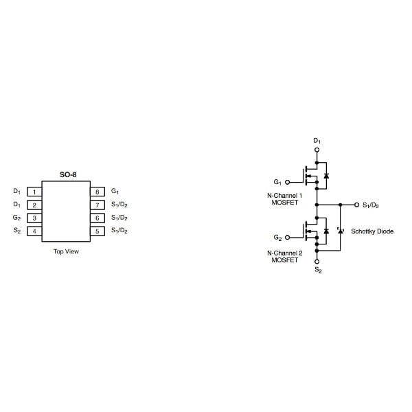 Si4914BDYDual N-Channel 30-V (D-S) MOSFET with Schottky DiodeChannel-1VDS = 30VID = 8.4A @ VGS = 10V, RDS(on) = 21mΩID = 7.4A @ VGS = 4.5V, RDS(on) = 27mΩChannel-2VDS = 30VID = 8A @ VGS = 10V, RDS(on) = 20mΩID = 8A @ VGS = 4.5V, RDS(on) = 25mΩShottky Product SummaryVDS = 30VIF = 2AVSD = 0.5V @ 1A