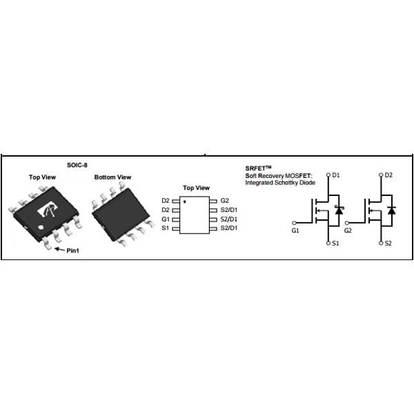 FET1(N-Channel)VDS=30VID=11A (VGS=10V)FET2(N-Channel)VDS=30VID=8AThe AO4932 uses advanced trench technology to provide excellent RDS(ON) and low gate charge. The two MOSFETs make a compact and efficient switch and synchronous rectifier combination for use in DC-DC converters. A monolithically integrated Schottky diode in parallel with the synchronous MOSFET to boost efficiency further.