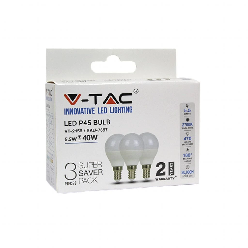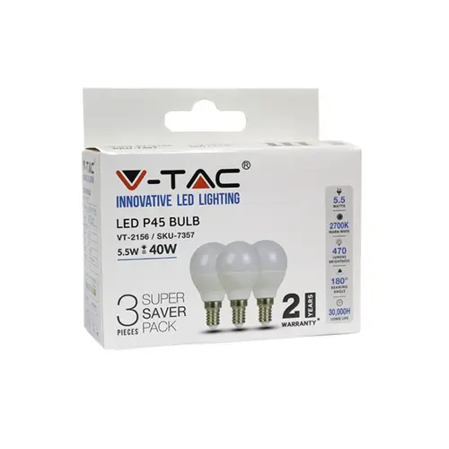 Διατίθεται σε πρακτική συσκευασία Box 3 τεμαχίων, προσφέροντας μια ολοκληρωμένη λύση για την άμεση αναβάθμιση πολλαπλών σημείων φωτισμού. Με την κλασική βάση E14, η τοποθέτηση είναι γρήγορη και απλή σε ένα πλήθος φωτιστικών σωμάτων. Η V-TAC εγγυάται την ποιότητα του προϊόντος προσφέροντας 2 χρόνια εγγύηση, διασφαλίζοντας μια αξιόπιστη λύση για κάθε εσωτερικό χώρο (IP20).
