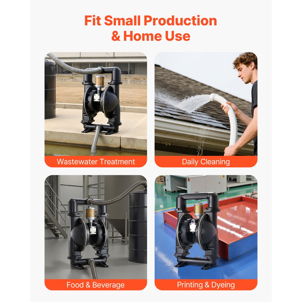 Ανθεκτική και στεγανή: Εξοπλισμένη με σώμα αντλίας από κράμα αλουμινίου και τριπλά στρώματα ελαστικών διαφραγμάτων για αντοχή στη φθορά. Αυτή η αντλία διαφράγματος που λειτουργεί με αέρα διαθέτει δομή πλήρους κοχλίωσης για ασφαλή στεγανοποίηση. Κατασκευασμένη για μακροχρόνια χρήση, λειτουργεί χωρίς φθορές. Ισχυρή πνευματική απόδοση: Προσφέρει μέγιστο ρυθμό ροής 158 GPM, μέγιστη πίεση 114 PSI και μέγιστη ανύψωση κεφαλής 262 ft. Αυτή η αντλία διαφράγματος αέρα μεταφέρει γρήγορα και αποτελεσματικά υγρά στις δεξαμενές-στόχους μέσα σε λίγα λεπτά χωρίς να ανησυχείτε για την πίεση. Τυπικό μέγεθος θύρας: Σχεδιασμένο με θύρες βιομηχανικού προτύπου που ενσωματώνονται άψογα με τις υπάρχουσες σωληνώσεις και τα εξαρτήματά σας. Η αντλία μεταφοράς με αέρα εξασφαλίζει σταθερή ροή αέρα, βελτιωμένη πνευματική απόδοση και αξιόπιστη λειτουργία. Ευέλικτος χειρισμός υγρών: Μεταφέρει αποτελεσματικά χρησιμοποιημένα λάδια, υδραυλικό λάδι, βενζίνη, ντίζελ, απορρυπαντικά, ακόμη και ποτά. Αυτή η πνευματική αντλία μεταφοράς δεν είναι κατάλληλη για διαβρωτικά οξέα/αλκάλια ή υγρά άνω των 140℉/60℃. Ευρεία γκάμα εφαρμογών: Αυτή η αντλία χρησιμοποιημένων ελαίων είναι ιδανική για πετρελαϊκές βιομηχανίες, μεταλλουργία, εκτύπωση, επεξεργασία νερού και αυτοκινητοβιομηχανίες. Οι εργολάβοι μπορούν να βασίζονται σε αυτήν για άσφαλτο, χρώματα και άλλα ιξώδη υγρά ή να κατασκευάσουν ένα οικιακό σύστημα συλλογής όμβριων υδάτων.
