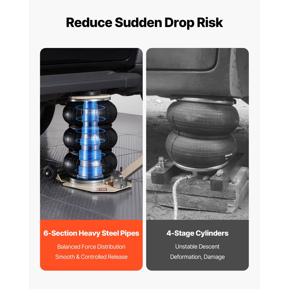 Γρήγορη ανύψωση αέρα σε δευτερόλεπτα: Ο γρύλος αέρα ανυψώνει 5,5-17,7 ίντσες/140-450 mm χωρίς φορτίο. Ανυψώνει το αυτοκίνητό σας σε 1-6 δευτερόλεπτα όταν συνδέεται με αεροσυμπιεστή, ιδανικό για αλλαγές ελαστικών, επισκευές κάτω μέρους του αμαξώματος και αλλαγές λαδιών. Χρησιμοποιήστε το με βάση γρύλου για μεγάλη στήριξη. Χωρητικότητα βαρέος φορτίου 3 τόνων: Αυτή η υποδοχή αερόσακου υποστηρίζει έως και 3 τόνους/6613 λίβρες, κατάλληλη για sedan, SUV, pickup και ελαφρά φορτηγά. Ο ενισχυμένος τριπλός αερόσακος και η διευρυμένη πλάκα βάσης εξασφαλίζουν ισχυρή, σταθερή απόδοση ανύψωσης. Ελεγχόμενη & Ασφαλής Κατάβαση: Η υποδοχή αερόσακου διαθέτει έξι σωλήνες από χάλυβα βαρέως τύπου στο εσωτερικό, ο καθένας με μικρότερη διαδρομή για ομαλή, σταθερή κάθοδο και ακριβή έλεγχο ύψους. Σταματά τις απότομες πτώσεις, κατανέμει ομοιόμορφα το βάρος και αποφεύγει την παραμόρφωση ή την κλίση. Μετακινείται εύκολα κάτω από οχήματα: Εξοπλισμένο με λαβή ρυθμιζόμενης γωνίας και ελαστικούς τροχούς, το γρύλο αέρα αυτοκινήτου μπορεί εύκολα να γλιστρήσει κάτω από το αυτοκίνητό σας ή να φτάσει σε βαθύτερα σημεία στήριξης σε γωνίες 45° ή 180°. Η θέση 90° το καθιστά συμπαγές και βολικό για αποθήκευση. Ασφαλής στήριξη οχήματος: Το πάνω μέρος του γρύλου ανύψωσης αέρα περιλαμβάνει ένα παχύ ελαστικό μαξιλαράκι που συγκρατεί σταθερά το σημείο επαφής του αυτοκινήτου για αντιολισθητική, ασφαλή στερέωση στο σασί. Η βαλβίδα διαθέτει συνδέσμους 1/4 ίντσας ΗΠΑ και ΕΕ, συμβατούς με αεροσυμπιεστές 0,8-1,0 MPa.
