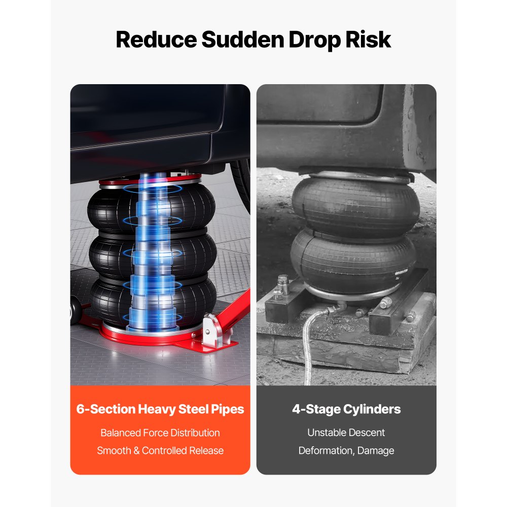 Γρήγορη ανύψωση αέρα σε δευτερόλεπτα: Ο γρύλος αέρα ανυψώνει 5,5-18,3 ίντσες/140-464 mm χωρίς φορτίο. Ανυψώνει το αυτοκίνητό σας σε 4-10 δευτερόλεπτα όταν συνδέεται με αεροσυμπιεστή, ιδανικό για αλλαγές ελαστικών, επισκευές κάτω μέρους του αμαξώματος και αλλαγές λαδιών. Χρησιμοποιήστε το με βάση γρύλου για μεγάλη στήριξη. Χωρητικότητα βαρέος φορτίου 5 τόνων: Αυτή η υποδοχή αερόσακου υποστηρίζει έως και 5 τόνους/11023 λίβρες, κατάλληλη για sedan, SUV, pickup και φορτηγά. Ο ενισχυμένος τριπλός αερόσακος και η διευρυμένη πλάκα βάσης εξασφαλίζουν ισχυρή, σταθερή απόδοση ανύψωσης. Ελεγχόμενη & Ασφαλής Κατάβαση: Η υποδοχή αερόσακου διαθέτει έξι σωλήνες από χάλυβα βαρέως τύπου στο εσωτερικό, ο καθένας με μικρότερη διαδρομή για ομαλή, σταθερή κάθοδο και ακριβή έλεγχο ύψους. Σταματά τις απότομες πτώσεις, κατανέμει ομοιόμορφα το βάρος και αποφεύγει την παραμόρφωση ή την κλίση. Μετακινείται εύκολα κάτω από οχήματα: Εξοπλισμένο με λαβή ρυθμιζόμενης γωνίας και ελαστικούς τροχούς, το γρύλο αέρα αυτοκινήτου μπορεί εύκολα να γλιστρήσει κάτω από το αυτοκίνητό σας ή να φτάσει σε βαθύτερα σημεία στήριξης σε γωνίες 45° ή 180°. Η θέση 90° το καθιστά συμπαγές και βολικό για αποθήκευση. Ασφαλής στήριξη οχήματος: Το πάνω μέρος του γρύλου ανύψωσης αέρα περιλαμβάνει ένα παχύ ελαστικό μαξιλαράκι που συγκρατεί σταθερά το σημείο επαφής του αυτοκινήτου για αντιολισθητική, ασφαλή στερέωση στο σασί. Η βαλβίδα διαθέτει συνδέσμους 1/4 ίντσας ΗΠΑ και ΕΕ, συμβατούς με αεροσυμπιεστές 0,8-1,0 MPa.