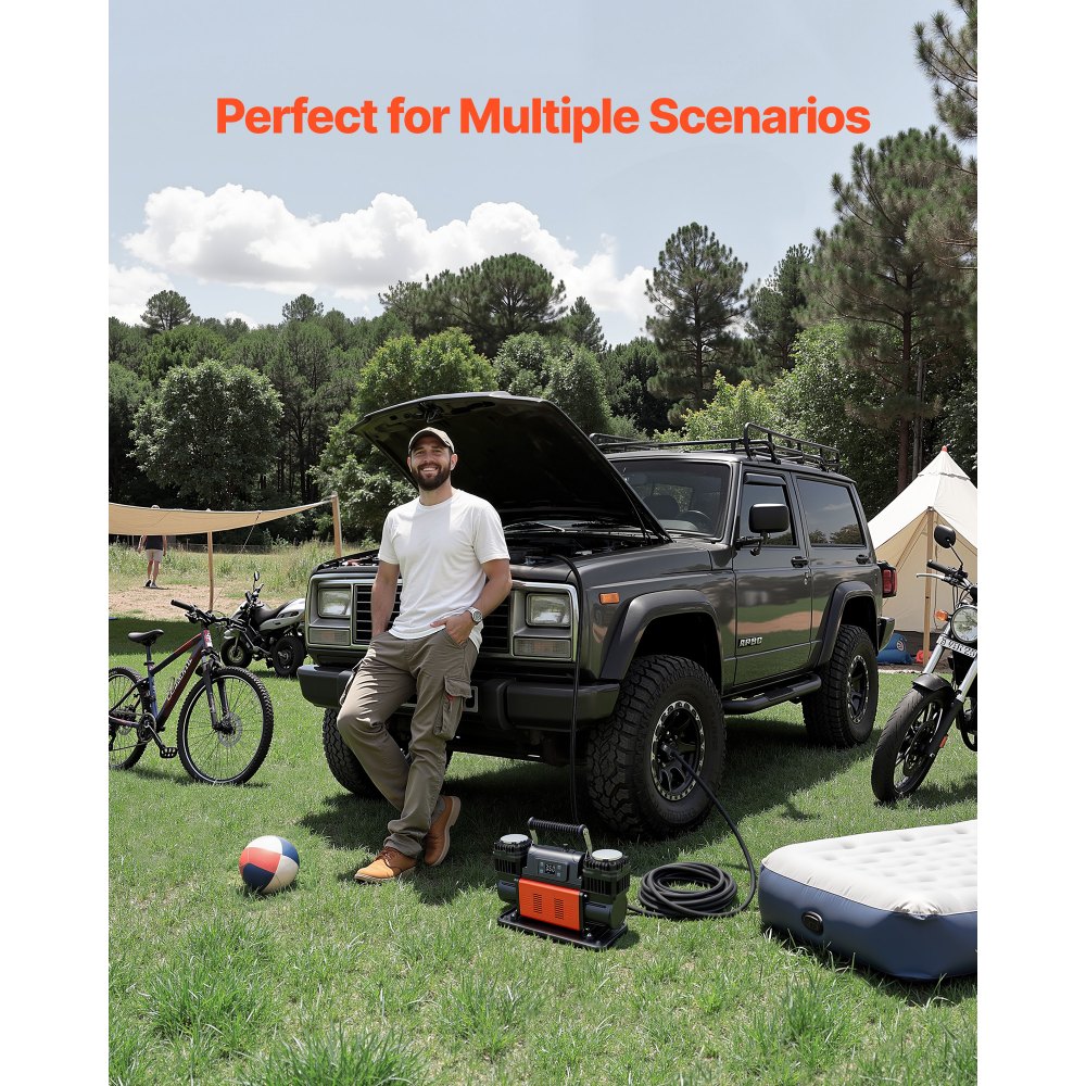 Εξαιρετικά γρήγορο φούσκωμα: Με αναβαθμισμένο σχεδιασμό διπλού κυλίνδρου, υψηλή ροή αέρα 300 L/min και μέγιστη πίεση λειτουργίας 150 PSI, ο αεροσυμπιεστής βαρέως τύπου 12V 1080W φουσκώνει 2 φορές πιο γρήγορα από άλλους, βοηθώντας σας να επιστρέψετε στο δρόμο σε χρόνο μηδέν. Προκαθορισμένη πίεση και αυτόματη διακοπή: Διατηρήστε τον έλεγχο με την ψηφιακή οθόνη LCD που παρακολουθεί την πίεση των ελαστικών σε πραγματικό χρόνο. Ρυθμίστε την επιθυμητή πίεση και θα σταματήσει αυτόματα όταν επιτευχθεί —— εξαλείφοντας την υπερπλήρωση, την υποπλήρωση και τη συνεχή παρακολούθηση του μετρητή πίεσης. Ευρείες εφαρμογές: Εξοπλισμένο με 3 προσαρμογείς ακροφυσίων και 1 προσαρμογέα κλειδώματος αντίχειρα, αυτό το φορητό φουσκωτό ελαστικών με αυτόματη διακοπή λειτουργίας είναι ιδανικό για αυτοκίνητα, SUV, φορτηγά, RV, καθώς και μοτοσικλέτες, ποδήλατα, μπάλες και εξοπλισμό αναψυχής όπως φουσκωτά παιχνίδια και σκάφη. Αξιόπιστη προστασία ασφαλείας: Κατασκευασμένη με σύστημα προστασίας από υπερθέρμανση, αυτή η αντλία αέρα βαρέως τύπου 150 PSI για χρήση εκτός δρόμου αποτρέπει τη ζημιά του κινητήρα από υψηλές θερμοκρασίες, εξασφαλίζοντας ασφαλή λειτουργία και μακροχρόνια απόδοση. Πλήρες πακέτο: Περιλαμβάνει αεροσυμπιεστή διπλού κυλίνδρου βαρέως τύπου με καλώδιο τροφοδοσίας 2 μέτρων + λαστιχένιο σωλήνα αέρα 7,8 μέτρων + 3 προσαρμογείς ακροφυσίου + προσαρμογέα κλειδώματος αντίχειρα + φορητή τσάντα εργαλείων. Πάντα έτοιμο για περιπέτεια εκτός δρόμου.