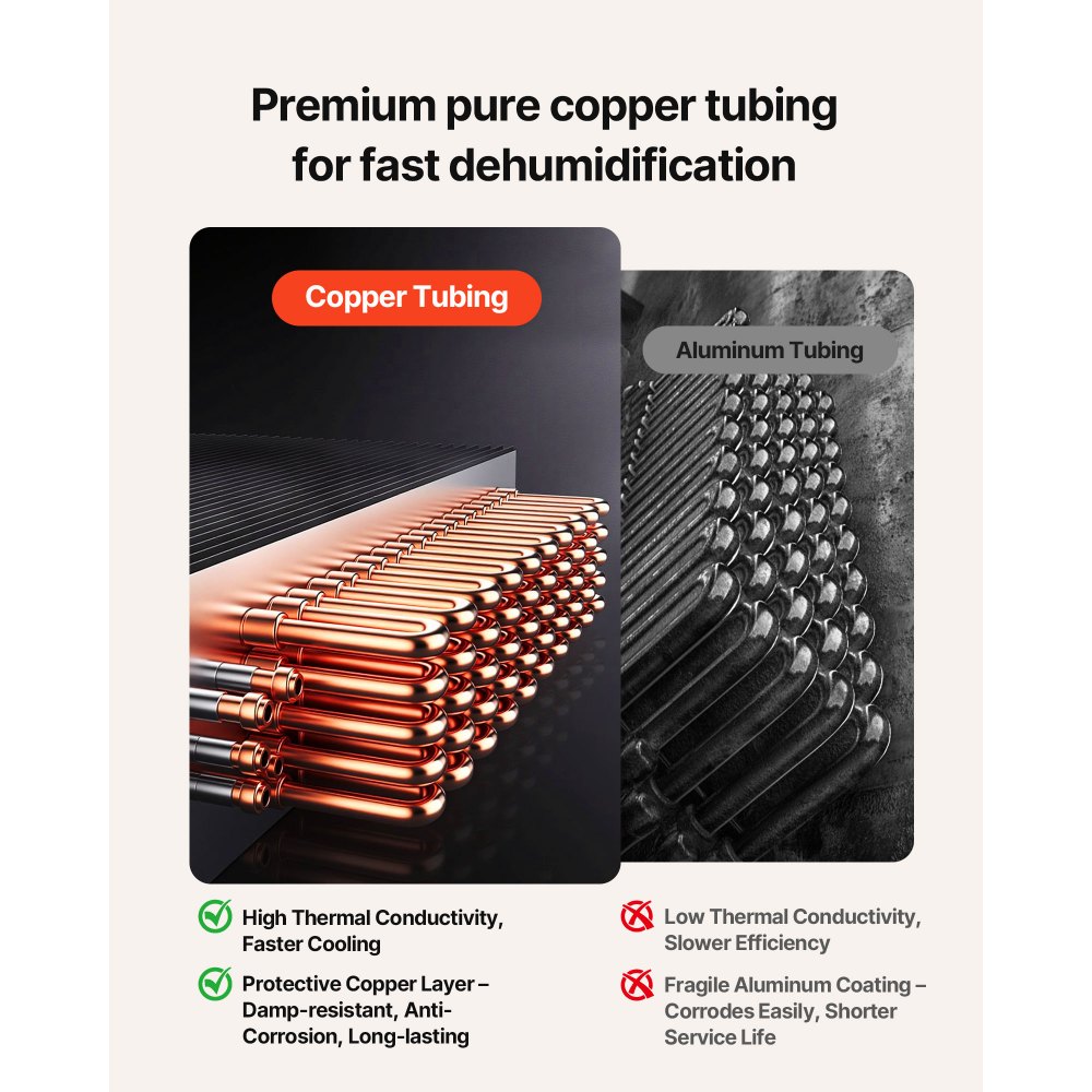 Ισχυρή αφύγρανση: Εξοπλισμένος με έναν συμπιεστή κορυφαίας ποιότητας, αυτός ο επαγγελματικός αφυγραντήρας απορροφά έως και 50 λίτρα/ημέρα (υπό συνθήκες κορεσμού), ιδανικός για χώρους διέλευσης, υπόγεια ή βιομηχανικές περιοχές έως 1.300 τετραγωνικά πόδια. Χάλκινοι σωλήνες για ψύξη: Σε σύγκριση με το αλουμίνιο, ο συμπυκνωτής από καθαρό χαλκό σε αυτόν τον βιομηχανικό αφυγραντήρα εξασφαλίζει ταχύτερη ψύξη, ταχύτερη εξαγωγή υγρασίας, καλύτερη αντοχή στη διάβρωση και μεγαλύτερη διάρκεια ζωής. Πολλαπλές λειτουργίες: Προσφέρει λειτουργίες Auto, Dry, Sleep και Smart Defrost για την κάλυψη διαφόρων αναγκών. Επιλέξτε την κατάλληλη ρύθμιση αφύγρανσης για κάθε περίσταση, ιδανική ως αφυγραντήρας καταστήματος ή για χρήση σε σπίτια, υπόγεια και εμπορικούς χώρους. Ευέλικτη εγκατάσταση: Ο αφυγραντήρας σε ανοιχτό χώρο υποστηρίζει εγκατάσταση στην οροφή για εξοικονόμηση χώρου στο δάπεδο ή σταθερή τοποθέτηση με ελαστικά μαξιλαράκια. Η ευέλικτη ρύθμιση σάς επιτρέπει να επιλέξετε την ιδανική μέθοδο εγκατάστασης με βάση τον χώρο και τις ανάγκες σας. Χωρίς συσσώρευση νερού: Ο αφυγραντήρας μας διαθέτει εύκαμπτο σωλήνα αποστράγγισης PVC 6,56 ποδιών για αυτόματη αποστράγγιση, χωρίς να χρειάζεται να αδειάσετε τη δεξαμενή. Το ανθεκτικό PVC εξασφαλίζει ομαλή, χωρίς διαρροές αποστράγγιση για επαγγελματική χρήση αφυγραντήρα.