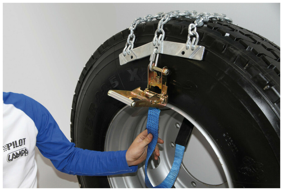 Αλυσίδα φορτηγού, ιταλικής προέλευσης, κατασκευασμένη από γαλβανιζέ σίδερο (ατσάλι, το οποίο έχει προστατευτικό επίστρωμα ψευδαργύρου, που προστατεύει το ατσάλι από την οξείδωση). Διαθέτει 3 κάθετες σειρές και 2 οριζόντιες από αλυσίδα σε σχήμα "D" με ενισχυμένους σταυρωτούς συνδέσμους και ιμάντα δέσης με καστάνια που προσαρμόζεται εύκολα και γρήγορα πάνω στον τροχό. Ιδανικό προιόν για οχήματα βαρέως τύπου, φορτηγά και SUV για ασφαλή οδήγηση σε χιόνι και πάγο.