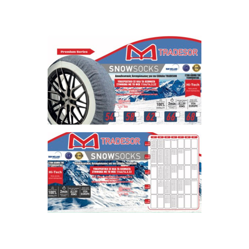 Χιονοκουβέρτες κατασκευασμένες από το πιο ανθεκτικό υλικό που κυκλοφορεί παγκοσμίως, αποτελεσματικές για άμεση βοήθεια σε χιονισμένους δρόμους. Σε περίπτωση ελέγχου, χρειάζεστε 1 σετ 2 τεμαχίων που εφαρμόζονται στους τροχούς κίνησης του οχήματος.