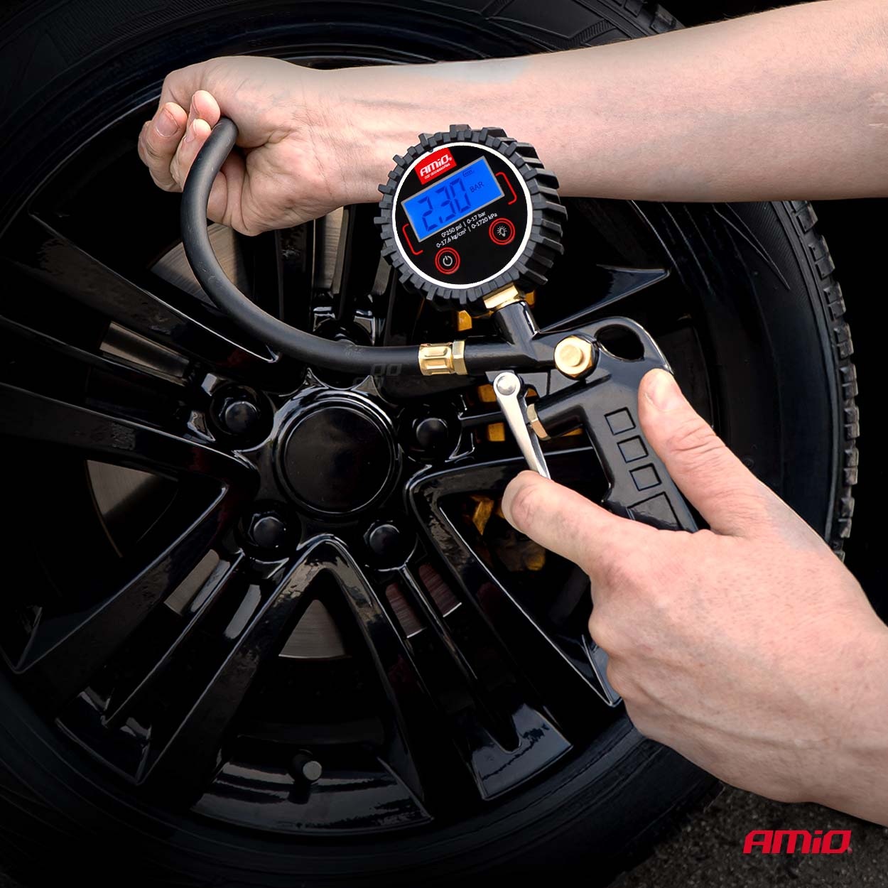 Amio - Επαγγελματικό αερόμετρο φουσκώματος με ψηφιακό μανόμετρο 17 bar – Οθόνη LCD βαλβίδα εκτόνωσης σωλήνας 30cm