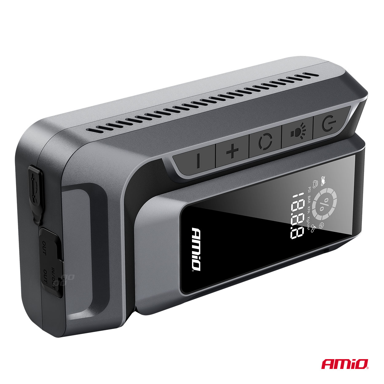 Amio - Φορητός Εκκινητής Μπαταρίας (Jump Starter) 4 σε 1 με ενσωματωμένο Κομπρεσέρ Αέρα, Powerbank και Φακό LED τάση λειτουργίας 12V με χωρητικότητα 12Ah και μέγιστο ρεύμα εκκίνησης 1600A για Επιβατικά Αυτοκίνητα - 1 τεμ. (04677/AM)