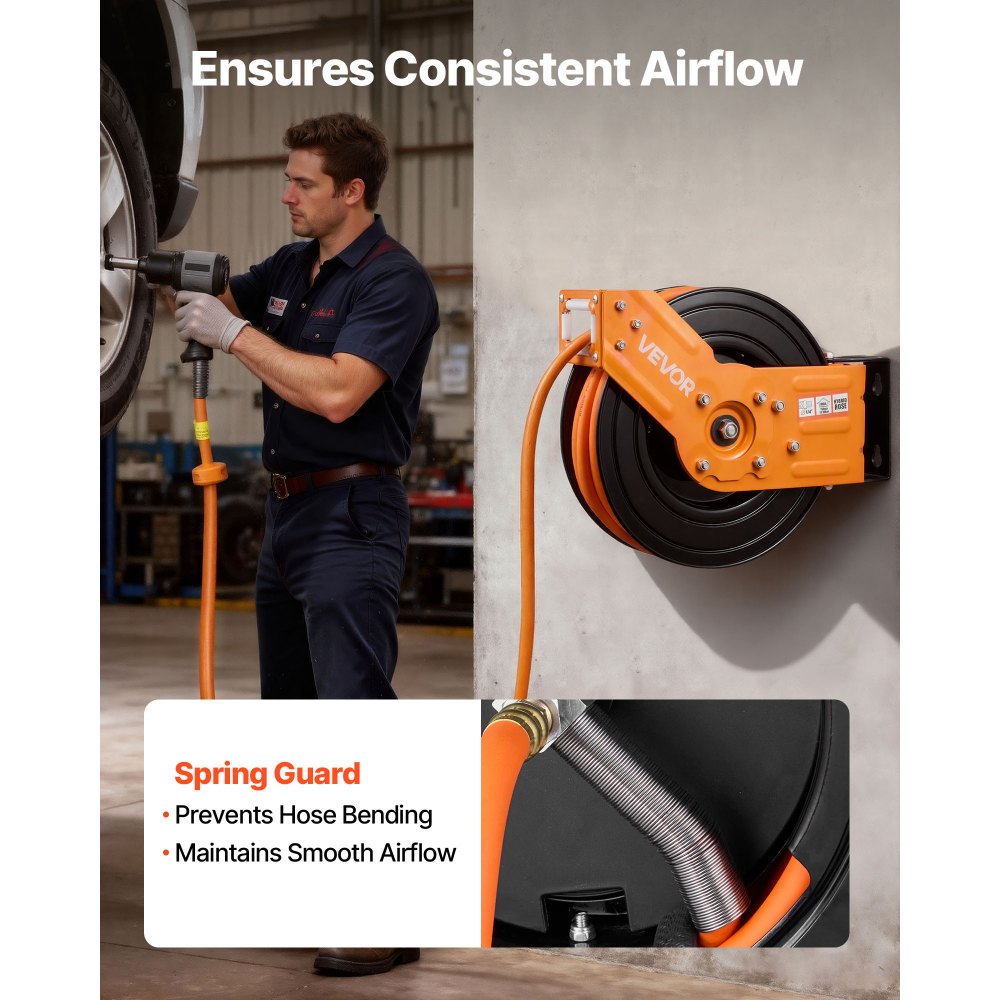 Τέλος στα μπερδεμένα λάστιχα: Το αναδιπλούμενο καρούλι λάστιχου αέρα VEVOR περιλαμβάνει υβριδικό λάστιχο αέρα 15m x 9,5 mm και έναν λάστιχο εισόδου 1,52 m για να διατηρεί τον χώρο εργασίας σας τακτοποιημένο και χωρίς μπερδέματα. Τέλος στα μπερδεμένα λάστιχα, μειώνοντας τη φθορά και τους κινδύνους πτώσης για πιο ασφαλή χρήση. Αυτόματη επανατύλιξη: Διαχειριστείτε τον εύκαμπτο σωλήνα σας εύκολα με το σύστημα αυτόματης επανατύλιξης — απλώς τραβήξτε τον απαλά και θα επανατυλιχτεί ομαλά. Το ρυθμιζόμενο πώμα και η ενσωματωμένη ασφάλεια σάς επιτρέπουν να ασφαλίζετε τον σωλήνα σε οποιοδήποτε μήκος, ενώ οι κύλινδροι που δεν μπλοκάρουν τον οδηγούν ομοιόμορφα για μείωση της φθοράς. Ανθεκτικός & Ευέλικτος: Ο υβριδικός μας σωλήνας αέρα αντέχει έως και 300PSI και λειτουργεί αξιόπιστα από -5℃ έως 45℃, αντιστεκόμενος στην περιστροφή, τη σύνθλιψη και το σκάσιμο για ομαλή ροή αέρα. Το ενσωματωμένο προστατευτικό ελατηρίου και το προστατευτικό περίβλημα από καουτσούκ παρέχουν επιπλέον προστασία για τον σωλήνα και την εφαρμογή, μειώνοντας την κάμψη και τη φθορά. Εύκολη σύνδεση και πολλαπλές χρήσεις: Ο εύκαμπτος σωλήνας αέρα μας έχει περάσει δοκιμές στεγανότητας και συνδέεται εύκολα με τα εργαλεία αέρα και τον συμπιεστή σας με το εξάρτημα BSP 1/4". Ιδανικός για φούσκωμα ελαστικών, βαφή με ψεκασμό και χειρισμό καθημερινών πνευματικών εργασιών DIY σε εργαστήρια. Βάση περιστροφής 180°: Η ανέμη του εύκαμπτου σωλήνα αεροσυμπιεστή μας διαθέτει βάση περιστροφής 180° για πιο ευέλικτη χρήση σε πολλαπλές κατευθύνσεις. Μπορεί να τοποθετηθεί σε οροφές, τοίχους ή δάπεδα, διατηρώντας τον εύκαμπτο σωλήνα σε κοντινή απόσταση και έτοιμο για χρήση χωρίς να τσακίζεται.