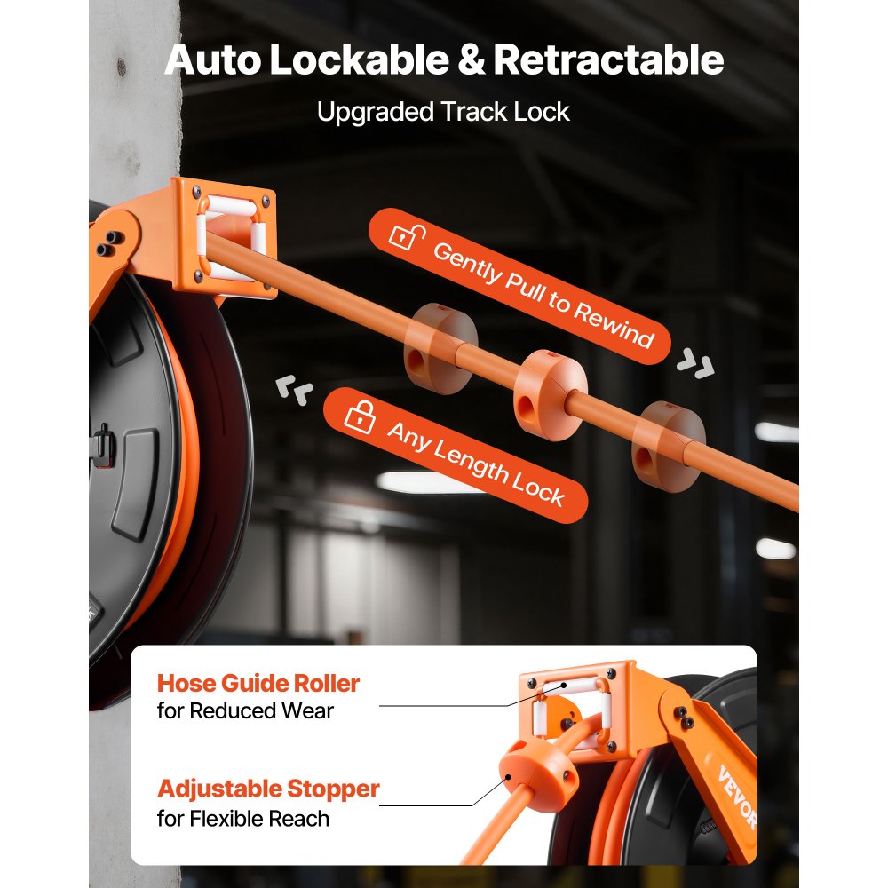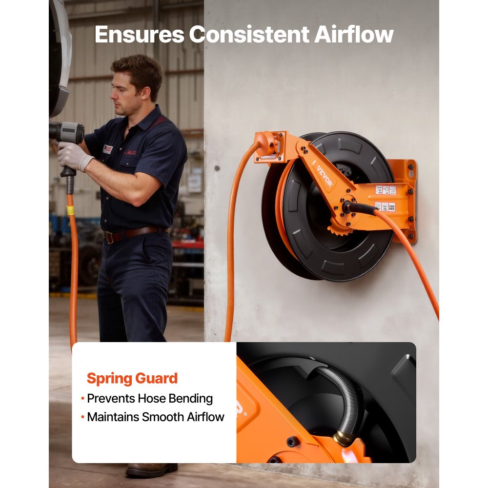 Τέλος στα μπερδεμένα λάστιχα: Το αναδιπλούμενο καρούλι λάστιχου αέρα VEVOR περιλαμβάνει υβριδικό λάστιχο αέρα 15m x 9,5 mm και έναν λάστιχο εισόδου 1,52 m για να διατηρεί τον χώρο εργασίας σας τακτοποιημένο και χωρίς μπερδέματα. Τέλος στα μπερδεμένα λάστιχα, μειώνοντας τη φθορά και τους κινδύνους πτώσης για πιο ασφαλή χρήση. Αυτόματη επανατύλιξη: Διαχειριστείτε εύκολα τον εύκαμπτο σωλήνα σας με το σύστημα αυτόματης επανατύλιξης — απλώς τραβήξτε τον απαλά και θα επανατυλιχτεί ομαλά. Το ρυθμιζόμενο πώμα και η ενσωματωμένη ασφάλεια καστάνιας σάς επιτρέπουν να ασφαλίζετε τον εύκαμπτο σωλήνα σε οποιοδήποτε μήκος, ενώ οι μη μπλοκαρισμένοι κύλινδροι τον οδηγούν ομοιόμορφα για μείωση της φθοράς. Ανθεκτικός & Ευέλικτος: Ο υβριδικός μας σωλήνας αέρα αντέχει έως και 300PSI και λειτουργεί αξιόπιστα από -5℃ έως 45℃, αντιστεκόμενος στην περιστροφή, τη σύνθλιψη και το σκάσιμο για ομαλή ροή αέρα. Το ενσωματωμένο προστατευτικό ελατηρίου και το προστατευτικό περίβλημα από καουτσούκ παρέχουν επιπλέον προστασία για τον σωλήνα και την εφαρμογή, μειώνοντας την κάμψη και τη φθορά. Διπλός βραχίονας για ισχυρή σταθερότητα: Ο ανθεκτικός χαλύβδινος κύλινδρος διπλού βραχίονα παρέχει σταθερή στήριξη και στις δύο πλευρές, διατηρώντας τον εύκαμπτο σωλήνα πιο σταθερό κατά την έκταση και την ανάσυρση. Μπορεί να τοποθετηθεί σε οροφές, τοίχους ή πάγκους εργασίας, διατηρώντας τον εύκαμπτο σωλήνα αέρα σε κοντινή απόσταση χωρίς να τσακίζεται. Εύκολη σύνδεση και πολλαπλές χρήσεις: Ο εύκαμπτος σωλήνας αέρα μας έχει περάσει δοκιμές στεγανότητας και συνδέεται εύκολα με τα εργαλεία αέρα και τον συμπιεστή σας με το εξάρτημα BSP 1/4". Ιδανικός για φούσκωμα ελαστικών, βαφή με ψεκασμό και χειρισμό καθημερινών πνευματικών εργασιών DIY σε εργαστήρια.