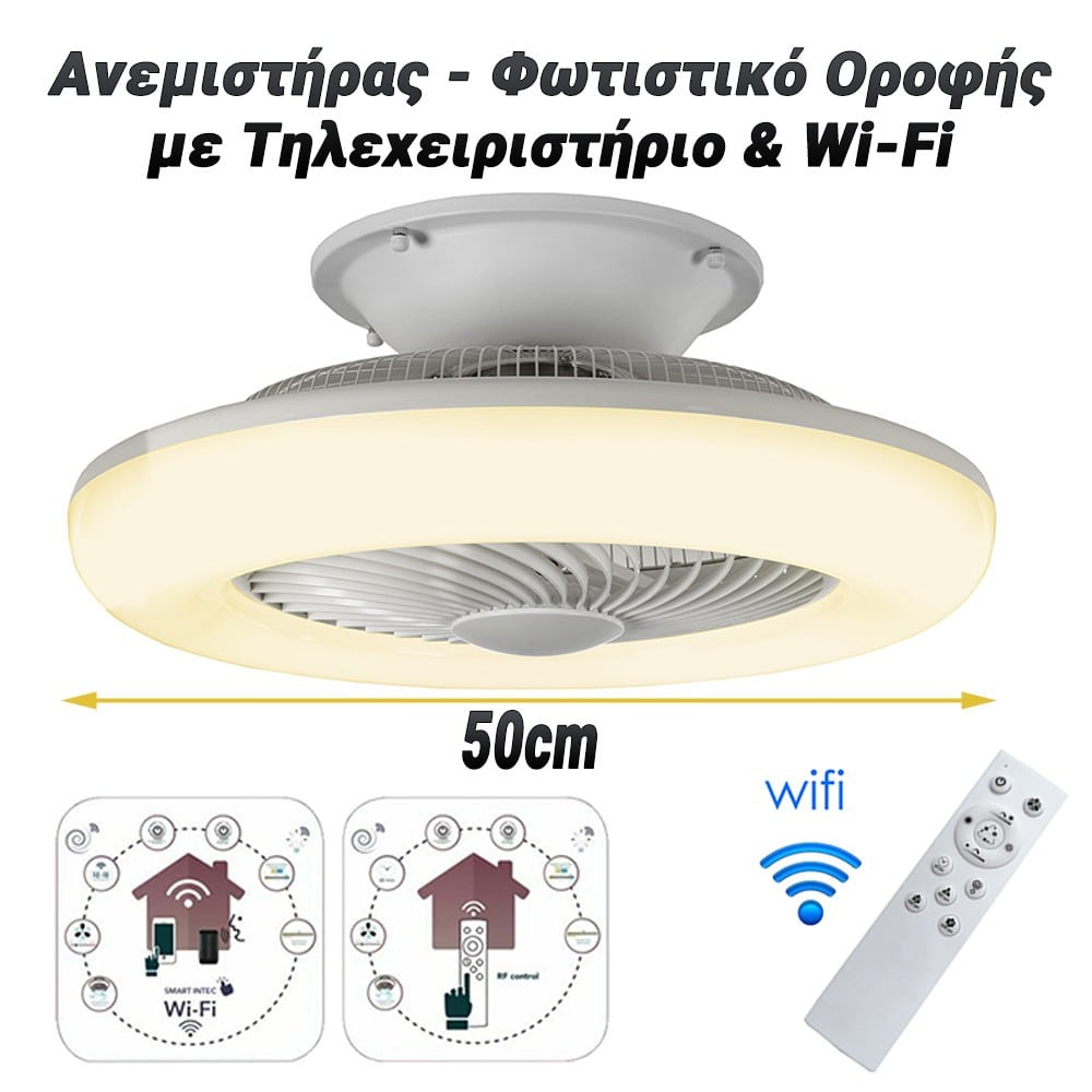 Ανεμιστήρας - Φωτιστικό Οροφής με Τηλεχειριστήριο & Wi-Fi με διάμετρο 50cm!Ένας ανεμιστήρας οροφής με ενσωματωμένο φωτιστικό!2 συσκευές σε 1 για να βελτιώσει τη βιωσιμότητα ενός σύγχρονου, έξυπνου σπιτιούΟ ανεμιστήρας είναι ρυθμιζόμενος σε 3 ταχύτητες, εξαπλώνεται σε όλο το δωμάτιο χάρη σε μια εξαιρετικά αθόρυβη περιστρεφόμενη στεφάνη 360°Το φως, με τεχνολογία LED, μπορεί να ρυθμιστεί τόσο ως προς την ένταση όσο και ως προς τη θερμοκρασία!Ο φωτισμός μπορεί να ρυθμιστεί από 3150 έως 3503 lumensΗ θερμοκρασία κυμαίνεται από 3000 K (θερμό φως) έως 4000 K (ουδέτερο φως) και έως 6500K (ψυχρό φως) ανάλογα με την περίστασηΑυτό επιτρέπει την επιλογή του κατάλληλου φωτός για κάθε ανάγκη και κατάσταση!Ο ανεμιστήρας και η φωτεινότητα ελέγχονται από ένα πρακτικό και καλαίσθητο τηλεχειριστήριο ή μέσω smartphone μέσω της εφαρμογής Toya Smart!Συμβατό, μέσω ενσωματωμένου Wi-Fi, με όλες τις συσκευές με φωνητική υποστήριξηΤεχνολογία που απλοποιεί και βελτιώνει τη βιωσιμότητα ενός σπιτιούΧαρακτηριστικά:3 ταχύτητεςΠεριστρεφόμενη στεφάνη3 θερμοκρασίες φωτόςΜέγιστη διάμετρος 55cmΧρονοδιακόπτης max. 60 λεπτάΣύνδεση SmartphoneΡυθμιζόμενο φωςΤεχνολογία Wi-FiΔιαστάσεις h22xø50cmΤροφοδοσία 220-240V~50Hz - Ισχύς 74W (ανεμιστήρας 40W, φωτιστικό οροφής 34W)Το τηλεχειριστήριο λειτουργεί με 2 μπαταρίες AAA (δεν περιλαμβάνονται)