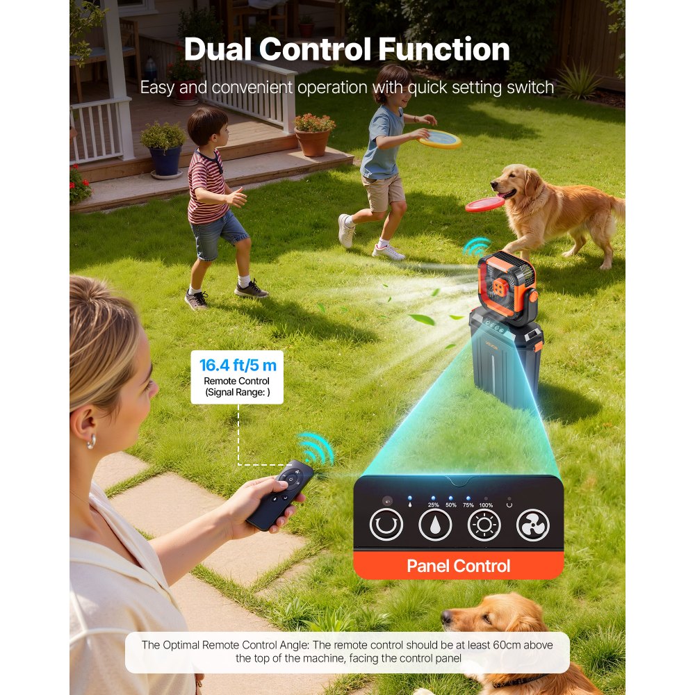 Μεγάλη δεξαμενή νερού: Εξοπλισμένη με δεξαμενή νερού 3,17 γαλονιών/12 λίτρων, αυτή η αντλία ψεκασμού με ανεμιστήρα προσφέρει διαρκή ψεκασμό μέσω τριών ρυθμιζόμενων λειτουργιών: μέγιστη συνεχής, ελάχιστη συνεχής και διαλειμματικός ψεκασμός. Η ρύθμιση μειώνει τη συχνότητα αναπλήρωσης και διατηρεί ομαλή ψύξη για μια πιο συνεπή εμπειρία. Όταν το νερό στον κουβά είναι χαμηλό, η ενεργοποίηση της λειτουργίας ύγρανσης θα προκαλέσει θόρυβο. Όταν χρησιμοποιείτε τη λειτουργία ύγρανσης, προσθέστε νερό έγκαιρα. Ρυθμιζόμενα επίπεδα αέρα: Με κινητήρα 2400 στροφών, ο φορητός μας ψεκαστήρας παρέχει ισχυρή και αθόρυβη κυκλοφορία. Τέσσερις ρυθμιζόμενες ταχύτητες αέρα σάς επιτρέπουν να εναλλάσσεστε εύκολα μεταξύ απαλής και ισχυρής ψύξης, υποστηρίζοντας διάφορες ρυθμίσεις, προσφέροντας παράλληλα σταθερή άνεση και αναζωογονητική ροή αέρα. Κατά τον ψεκασμό, η ομίχλη νερού συλλέγεται σε σταγονίδια, τα οποία ρέουν μέσω του πάνελ στο κανάλι νερού στο κάλυμμα και πίσω στον κουβά νερού, εμποδίζοντας το δάπεδο να βραχεί. Μπαταρία υψηλής χωρητικότητας: Αυτός ο ανεμιστήρας υδρονέφωσης VEVOR διαθέτει μπαταρία 20000mAh που φορτίζει σε περίπου 9-12 ώρες και προσφέρει μεγάλη διάρκεια ψύξης μετά από κάθε φόρτιση. Υποστηρίζει καθημερινή χρήση και εξωτερικές δραστηριότητες με σταθερή ροή αέρα και υδρονέφωση, επιτρέποντάς σας να απολαμβάνετε αναζωογονητική άνεση όπου κι αν βρίσκεστε. Ρυθμιζόμενες λειτουργίες φωτισμού: Ο ανεμιστήρας ψύξης νερού μας παρέχει τρεις επιλογές φωτισμού που σας επιτρέπουν να ρυθμίζετε τη φωτεινότητα για συγκεντρώσεις, κάμπινγκ ή καθημερινή χρήση. Η οριζόντια κίνηση 120° και η κάθετη κλίση 120° υποστηρίζουν ομοιόμορφη ροή αέρα και κάλυψη φωτός, προσφέροντάς σας άνεση από πολλαπλές γωνίες. Διπλές επιλογές ελέγχου: Με τηλεχειριστήριο και πίνακα ελέγχου, αυτός ο ανεμιστήρας ψεκασμού νερού VEVOR προσαρμόζεται στις συνήθειές σας για εύκολη χρήση. Μπορείτε να αλλάζετε ταχύτητες, να αλλάζετε λειτουργίες ή να ρυθμίζετε γρήγορα το χρονοδιακόπτη, διατηρώντας τη λειτουργία βολική και αποτελεσματική σε ένα ευρύ φάσμα καθημερινών ρυθμίσεων.