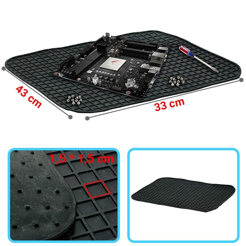 Εξαιρετικής ποιότητας ελαστική αντιστατική και αντιολισθητική επιφάνεια εργασίας με δίκτυ πλέξης τετράγωνα 15*15mm για χαρτογράφηση υλικών και βιδών της συσκευής. Στο κάτω μέρος διαθέτει προεξοχές προφυλάσσοντας ότι υπάρχει πάνω από την επιφάνεια από υγρά που ενδεχομένως χυθούν από ατύχημα στο πάγκο. Το υλικό της δεν είναι 100% άφλεκτο αλλά δεν λιώνει και με το κολλητήρι εύκολα. Μπορεί να κοπεί εύκολα στις διατάσεις που προτιμούμε. Μπορεί να πλυθεί με σαπούνι και νερό.