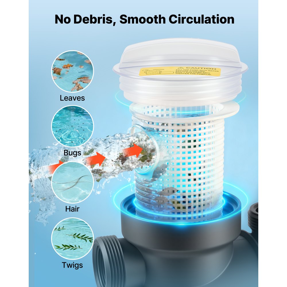 Ισχυρή αντλία πισίνας 250W: Αυτή η αντλία πισίνας διαθέτει χάλκινο κινητήρα για σταθερή, υψηλής απόδοσης και αθόρυβη λειτουργία. Με μέγιστη ροή 11.700 L/H και μέγιστο μανομετρικό 8 m, προσφέρει αποτελεσματική κυκλοφορία νερού για μια καθαρή εμπειρία κολύμβησης. Περιλαμβάνονται καλάθι φίλτρου και καπάκι: Σχεδιασμένη με ένα μεγάλο καλάθι φίλτρου, αυτή η αντλία πισίνας βοηθά στην παγίδευση των υπολειμμάτων και στην παράταση των διαστημάτων καθαρισμού. Το διαφανές καπάκι επιτρέπει γρήγορους οπτικούς ελέγχους της κατάστασης φιλτραρίσματος για εύκολη συντήρηση. Πολυεπίπεδη προστασία: Η αντλία πισίνας είναι κατασκευασμένη με ενισχυμένο θερμοπλαστικό περίβλημα για υψηλή αντοχή και αντοχή στη διάβρωση. Με κινητήρα αδιάβροχο IPX5 και ανθεκτικό στη θερμότητα κατηγορίας F, εξασφαλίζει αξιόπιστη λειτουργία υπό υψηλό φορτίο ή συνεχή χρήση. Εγκατάσταση χωρίς προβλήματα: Αυτή η αντλία πισίνας διαθέτει τυπικές θύρες με συνδέσεις που περιστρέφονται για γρήγορη εγκατάσταση χωρίς εργαλεία. Διαθέτει συνδέσμους σωλήνων και δακτυλίους στεγανοποίησης για ανθεκτικές σε διαρροές, ασφαλείς συνδέσεις και αποτελεσματική κυκλοφορία. Ευρύ φάσμα εφαρμογών: Ειδικά σχεδιασμένη για υπέργειες πισίνες, αυτή η αντλία πισίνας είναι κατάλληλη για πισίνες, υδρομασάζ, σπα και συστήματα άρδευσης. Σημείωση: Δεν είναι κατάλληλη για πισίνες εντός εδάφους. Πριν ξεκινήσετε την αντλία, βεβαιωθείτε ότι είναι γεμάτη με νερό. Ελέγξτε ότι το πώμα αποστράγγισης είναι καλά κλεισμένο και, στη συνέχεια, προσθέστε νερό μέχρι να ξεχειλίσει. Η περίσσεια νερού θα γεμίσει το σύστημα και θα προστατεύσει τα εσωτερικά εξαρτήματα.