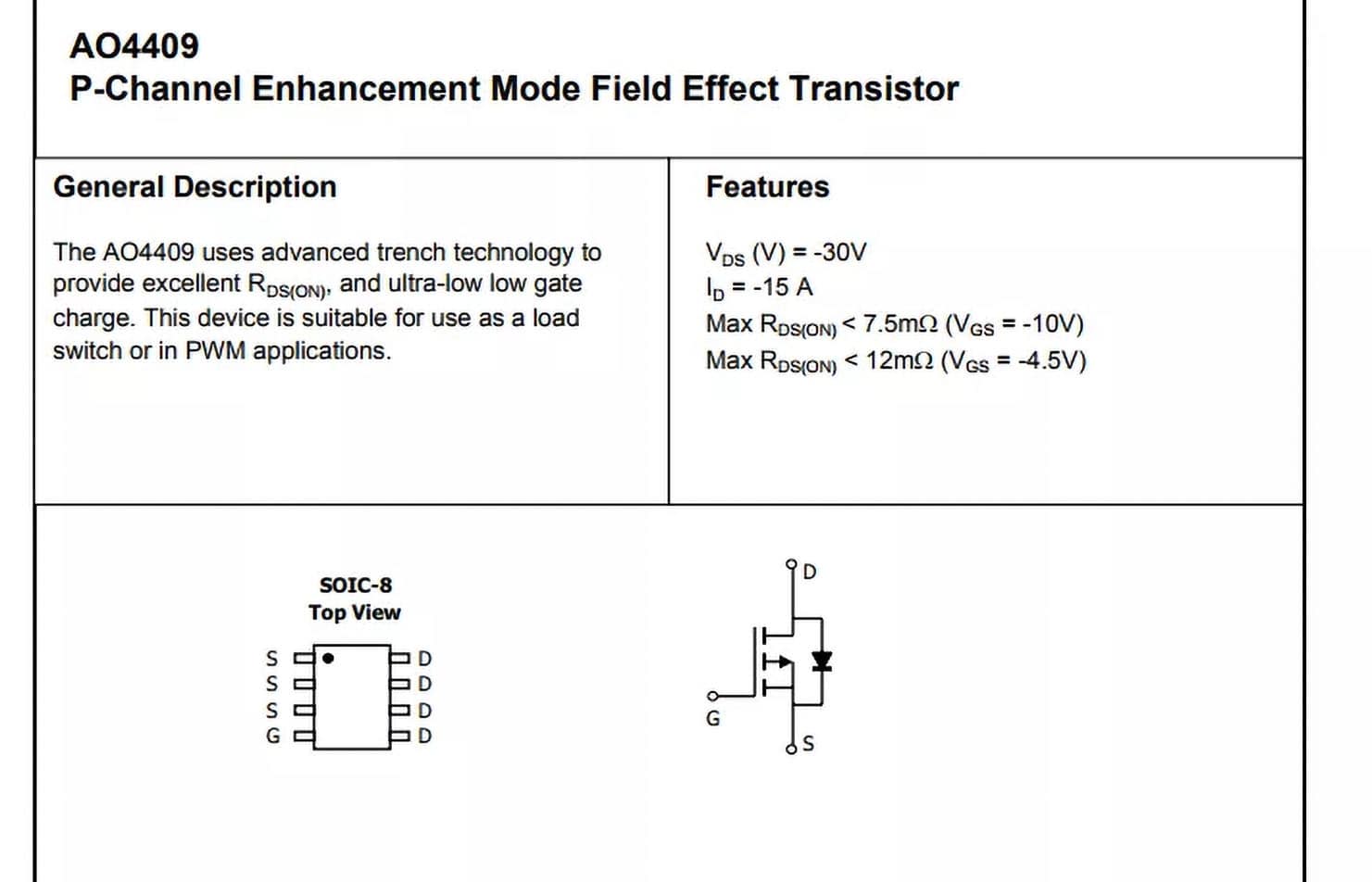 AO4409P-Channel PowerTrench® MOSFET-30V, -15A, 12.0mΩ VDS=-30VID=-15A @ VGS=-10VID=-15A @ VGS=-4.5V