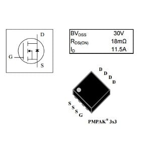 VDS = 30VRDS = 18mΩID = 11.5AAdvanced Power MOSFETs from APEC provide the designer with the best combination of fast switching, ruggedized device design, low on-resistance and cost-effectiveness. The PMPAK® 3x3 package is special for DC-DC converters application and lower 1.0mm profile with backside heat sink.