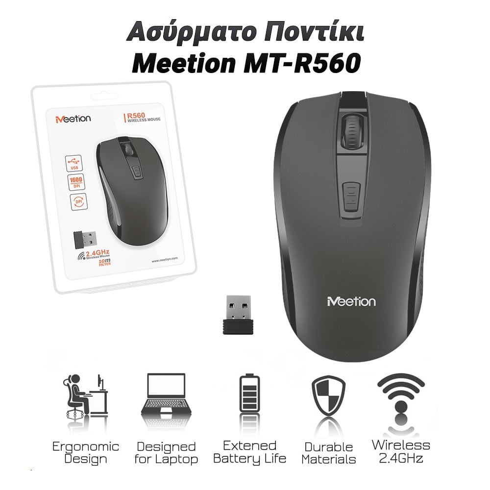 Το Ασύρματο Ποντίκι Meetion MT-R560 είναι η ιδανική επιλογή για όσους αναζητούν έναν αξιόπιστο και άνετο ποντίκι για καθημερινή χρήση. Με εργονομικό σχεδιασμό και ασύρματη σύνδεση, αυτό το ποντίκι προσφέρει εξαιρετική άνεση και ευκολία κινήσεων, καθιστώντας το ιδανικό για εργασία, μελέτη, ή ψυχαγωγία. Χαρακτηριστικά: Σύνδεση: Ασύρματη σύνδεση 2.4GHz για σταθερή και αξιόπιστη απόδοση χωρίς καλώδια Εμβέλεια: Εμβέλεια έως 10 μέτρα για άνετη χρήση σε κάθε χώρο Ανάλυση: Ρυθμιζόμενη ανάλυση DPI, ιδανική για ακριβή έλεγχο σε διαφορετικές εφαρμογές Σχεδιασμός: Εργονομικός σχεδιασμός για άνετη χρήση και μειωμένη καταπόνηση του καρπού Μπαταρία: Χαμηλή κατανάλωση ενέργειας με μακροχρόνια διάρκεια μπαταρίας για μεγαλύτερη αυτονομία Συμβατότητα: Συμβατό με Windows, macOS, και άλλες πλατφόρμες, για χρήση με υπολογιστές, laptops, και άλλες συσκευές Το Ασύρματο Ποντίκι Meetion MT-R560 συνδυάζει απόδοση και άνεση σε ένα κομψό και λειτουργικό σχέδιο. Με την αξιόπιστη ασύρματη σύνδεση και τη δυνατότητα προσαρμογής της ανάλυσης DPI, αυτό το ποντίκι σας προσφέρει τον έλεγχο και την ακρίβεια που χρειάζεστε για κάθε εργασία. Αναβαθμίστε την καθημερινή σας εργασία με το Meetion MT-R545 και απολαύστε ασύρματη ελευθερία και εργονομία στο γραφείο ή το σπίτι σας. Type R560 Wireless Mouse Size 110*60*37mm Weight 60±5g Colors Black, White, Gray, Chocolate Transmission Range approx:10m Resolution 800/1200/1600dpi Interface Type USB Number of Buttons 3+1 buttons Battery AA*1 Compatible systems Win XP/Vista/7/8/10/MAC OS
