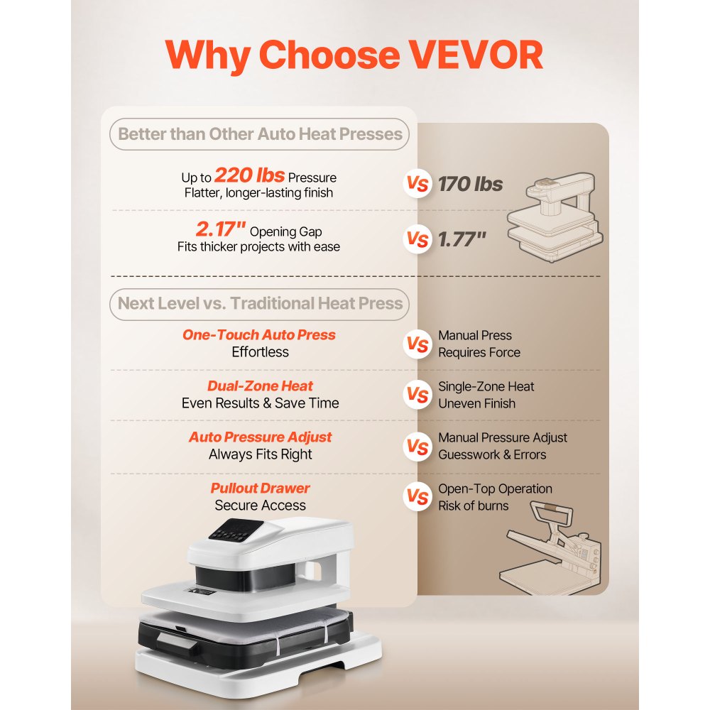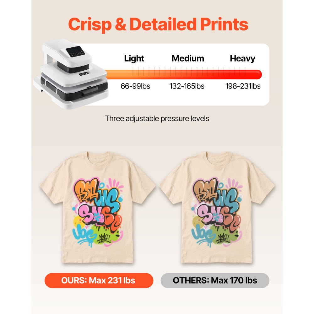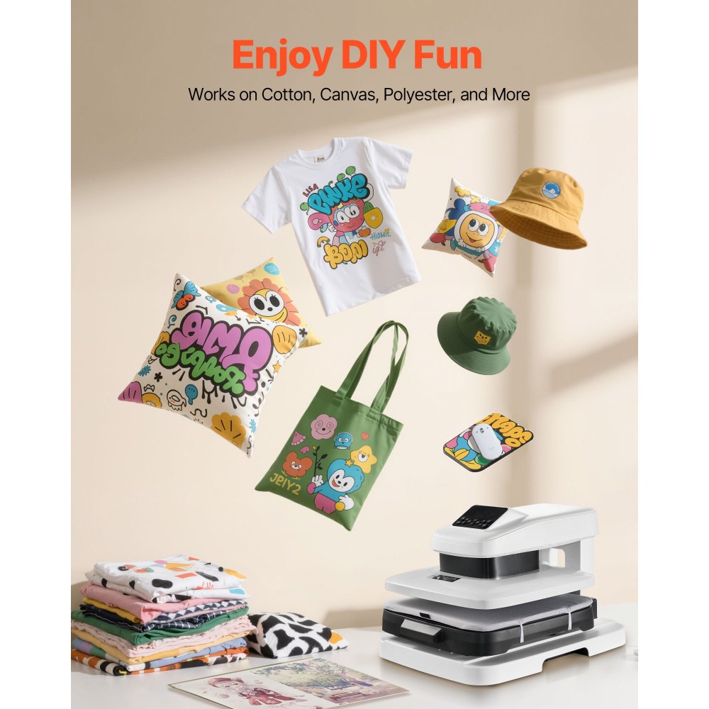 Αυτόματη συμπίεση χωρίς χέρια: Απλώς τοποθετήστε το υλικό σας, κλείστε το καπάκι και πατήστε Έναρξη. Η αυτόματη θερμαινόμενη πρέσα ρυθμίζει αυτόματα την πίεση, πιέζει, μετράει αντίστροφα και απελευθερώνει, εξασφαλίζοντας άψογες μεταφορές με 50% λιγότερη χειροκίνητη προσπάθεια για όλα τα επίπεδα δεξιοτήτων. Ταχεία Διπλή Θέρμανση: Αυτή η αυτόματη πρέσα θερμότητας παρέχει έως και 231 λίβρες πίεσης για διαρκείς μεταφορές σε ύφασμα, ξύλο και κεραμικά. Η διπλή θέρμανση σωλήνα εξασφαλίζει γρήγορη και ομοιόμορφη θέρμανση σε όλη την πλάκα 15 x 15 ιντσών, με διάκενο 2,17 ιντσών για παχύτερα αντικείμενα. Έξυπνα χειριστήρια: Η αυτόματη πρέσα θέρμανσης σάς επιτρέπει να ρυθμίζετε τη θερμοκρασία (32-410℉/0-210℃), την πίεση (3 επίπεδα) και τον χρόνο (0-999s) μέσω ψηφιακής οθόνης και κουμπιών. Αυτόματη απενεργοποίηση μετά από 15 λεπτά αδράνειας. Πατήστε οποιοδήποτε κουμπί για να σταματήσετε τη θέρμανση και σηκώστε αμέσως την πλάκα. Κιτ έτοιμου προς δημιουργία: Αυτή η πρέσα θερμότητας διαθέτει δύο προκαθορισμένες λειτουργίες και δύο προσαρμοσμένες υποδοχές για την αποθήκευση ρυθμίσεων για διαφορετικά έργα, χωρίς να χρειάζεται επαναφορά κάθε φορά. Συνοδεύεται από χαρτί εξάχνωσης υψηλής ποιότητας και ύφασμα ανθεκτικό στη θερμότητα για δημιουργία αμέσως μόλις την βγάλετε από τη συσκευασία. Universal Pro Press: Αυτή η ευέλικτη μηχανή θερμικής πρέσας χειρίζεται με ευκολία μπλουζάκια, τσάντες, ρούχα και ξύλινες πινακίδες. Το συμπαγές ατσάλινο σώμα της (20,08 x 15,75 x 14,17 ίντσες) ταιριάζει άψογα σε πάγκους εργασίας ή ράφια.