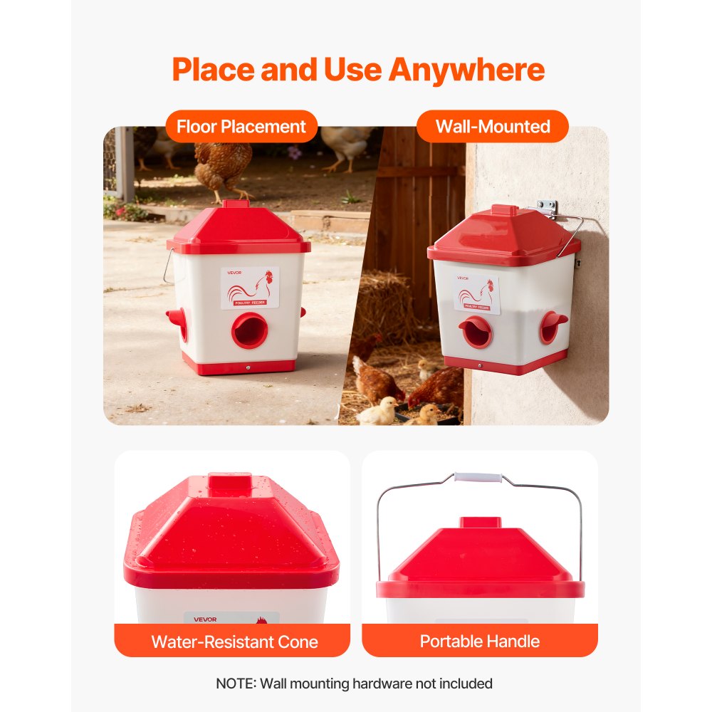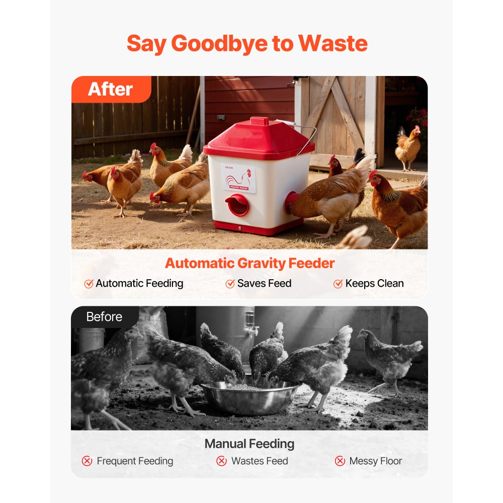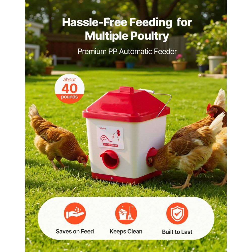 Ιδανική Αυτόματη Ταΐστρα: Αυτή η αυτόματη ταΐστρα κοτόπουλου 40 λίβρες διαθέτει 3 θύρες. Κατασκευασμένη από ανθεκτικό PP, είναι ανθεκτική και ασφαλής, ενώ ο σχεδιασμός τροφοδοσίας με βαρύτητα διατηρεί την τροφή φρέσκια και καθαρή, εξοικονομώντας χρόνο και προσπάθεια, ακόμη και σε σύντομες απουσίες. Μεγάλη χωρητικότητα 12 κιλών: Αυτή η αυτόματη ταΐστρα πουλερικών χωράει 12 κιλά μικρής, θρυμματισμένης ή θρυμματισμένης τροφής, ταΐζοντας 10-12 ενήλικα κοτόπουλα για 12-17 ημέρες. Διαθέτει τρεις θύρες τροφοδοσίας, εκτεταμένο σχεδιασμό και δακτυλίους στεγανοποίησης για να μην εισχωρεί στη βροχή για ξηρή τροφή. Διατηρεί την τροφή ασφαλή: Κάθε θύρα τροφοδοσίας της ταΐστρας κοτόπουλου διαθέτει ένα αποσπώμενο κάλυμμα ανθεκτικό στην υγρασία για να εμποδίζει ζώα όπως σκίουρους και πουλιά να κλέβουν τροφή. Μειώνει την απώλεια τροφής όταν τοποθετείται σε εξωτερικό χώρο, διασφαλίζοντας ότι η τροφή των πουλερικών σας παραμένει ασφαλής. Καθαρότερο κοτέτσι, λιγότερα απόβλητα: Χωρίς χυμένη τροφή! Αυτή η αυτόματη ταΐστρα κοτόπουλου διατηρεί το κοτέτσι σας τακτοποιημένο, μειώνει τα απόβλητα τροφής και εξοικονομεί χρήματα. Η μυτερή, αδιάβροχη κορυφή αποτρέπει τη συσσώρευση βροχής, διατηρώντας την ταΐστρα στεγνή και καθαρή. Εύκολη χρήση και μετακίνηση: Εξοπλισμένη με μια βολική λαβή για εύκολη μετακίνηση, η αδιάβροχη ταΐστρα κοτόπουλου μας μπορεί να τοποθετηθεί στο έδαφος ή να κρεμαστεί σε τοίχους ή φράχτες. Ιδανική για εσωτερικούς χώρους, μικρά αγροκτήματα και κοτέτσια, επιτρέποντας ευέλικτη και απλή χρήση.