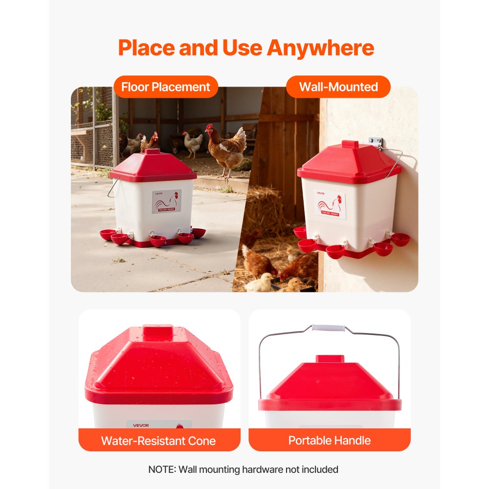 Ιδανικό αυτόματο τάισμα: Αυτό το αυτόματο ποτιστήρι κοτόπουλου 5 γαλονιών διαθέτει 6 θύρες ποτίσματος. Κατασκευασμένο από ανθεκτικό PP, είναι ανθεκτικό και ασφαλές, ενώ ο σχεδιασμός τροφοδοσίας με βαρύτητα διατηρεί την τροφή φρέσκια και καθαρή, εξοικονομώντας χρόνο και προσπάθεια, ακόμη και σε σύντομες απουσίες. Άφθονη παροχή νερού: Η αυτόματη ποτίστρα πουλερικών μεγάλης χωρητικότητας 5 γαλονιών παρέχει σταθερή παροχή καθαρού πόσιμου νερού, ελαχιστοποιώντας τον κίνδυνο μόλυνσης. Ο σχεδιασμός του βαθιού μπολ διευκολύνει την πόση για τα πουλερικά και ελαχιστοποιεί την διαρροή κατά το ράμφισμα. Αυτόματη αναπλήρωση νερού: Με ενσωματωμένο σύστημα αυτόματης αναπλήρωσης, αυτή η ποτίστρα για κοτόπουλα ανιχνεύει τα επίπεδα νερού και αναπληρώνει το μπολ ανάλογα με τις ανάγκες, εξασφαλίζοντας σταθερή παροχή φρέσκου νερού. Μειώνει την καθημερινή συντήρηση και αποφεύγει την αφυδάτωση ή την ανεπαρκή πρόσληψη νερού. Καθαρό νερό, λιγότερα απόβλητα: Πείτε αντίο στο σκορπισμένο νερό! Αυτή η αυτόματη ποτίστρα για κοτόπουλα διατηρεί το κοτέτσι σας τακτοποιημένο, μειώνει τα απόβλητα νερού και εξοικονομεί χρήματα. Η μυτερή, αδιάβροχη κορυφή αποτρέπει τη συσσώρευση βροχής, διατηρώντας την ποτίστρα στεγνή και καθαρή. Εύκολη χρήση και μετακίνηση: Εξοπλισμένη με μια βολική λαβή για εύκολη μετακίνηση, η ποτίστρα κοτόπουλων μας μπορεί να τοποθετηθεί στο έδαφος ή να κρεμαστεί σε τοίχους ή φράχτες. Ιδανική για εσωτερικούς χώρους, μικρά αγροκτήματα και κοτέτσια, επιτρέποντας ευέλικτη και απλή χρήση.