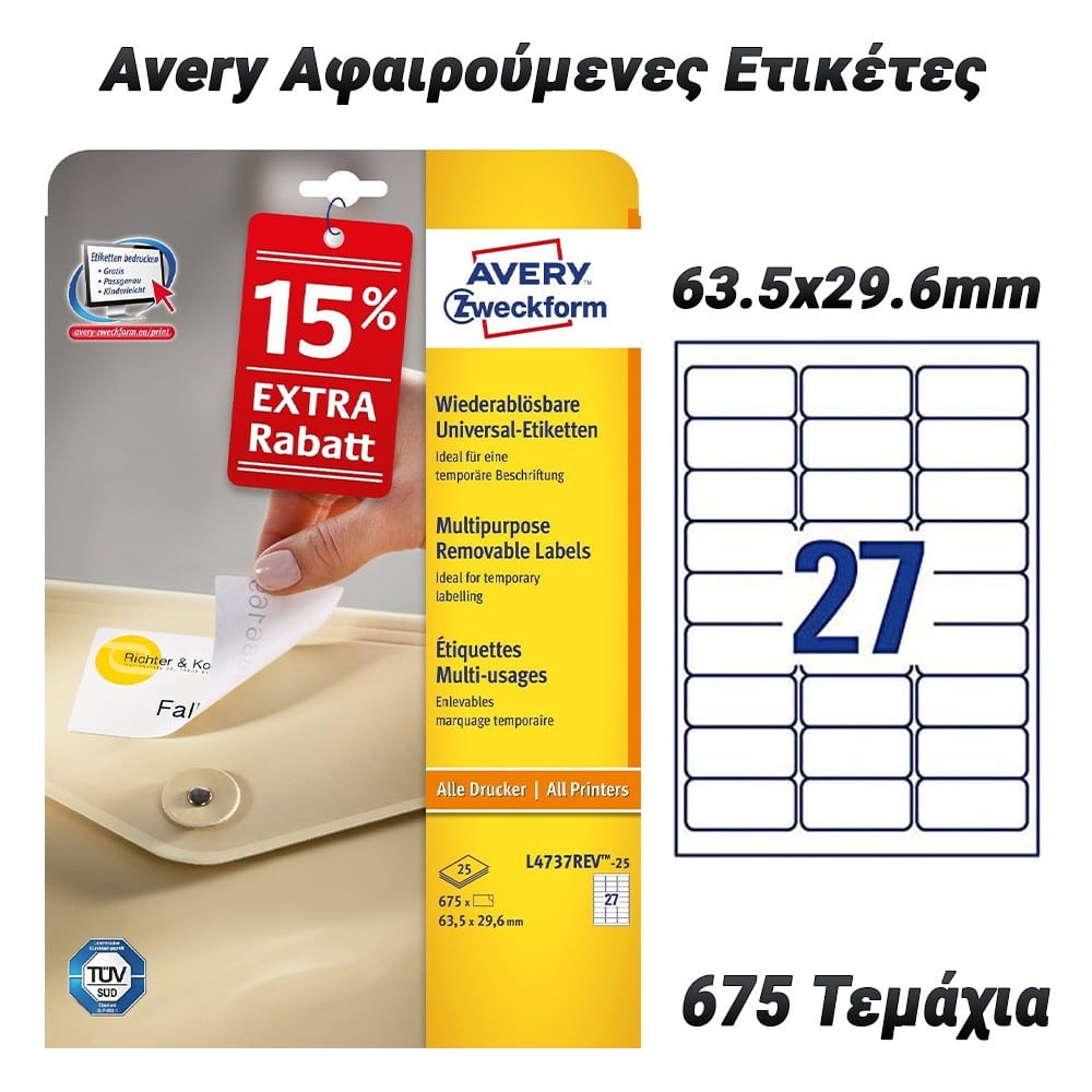 Ιδανικές για οποιαδήποτε προσωρινή σήμανση.Εύκολη αφαίρεση των ετικετών.Ιδανικό για όλους: αλλαγή του περιεχομένου των φακέλων, των αρχείων ή των κουτιών σας, δημιουργία προσωρινών σημειώσεων, οδηγιών ή ετικετών ιδιοκτησίαςΠροσκολλάται με ακρίβεια αλλά αφαιρείται εύκολα χωρίς να αφήνει υπολείμματα - κατάλληλο για τις περισσότερες επιφάνειες.Για τα καλύτερα αποτελέσματα εκτύπωσης με τον έγχρωμο εκτυπωτή λέιζερ σαςΓρήγορη και εύκολη χρήση με το δωρεάν λογισμικό Avery Wizard για το Microsoft OfficeL4737REV-25 Ετικέτες, 63,5 x 29,6 mm, λευκές, 675 τεμάχια