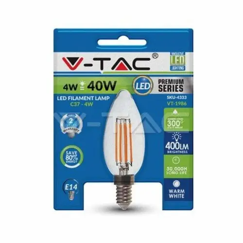 Η VTAC LED λάμπα Filament E14 σε σχήμα κεριού αποδίδει θερμό λευκό φως 2700K, δημιουργώντας άνετο και φιλόξενο περιβάλλον σε οικιακούς και διακοσμητικούς χώρους. Με φωτεινότητα 400 lumen και ευρεία δέσμη 300°, φωτίζει ομοιόμορφα χωρίς σκοτεινά σημεία.