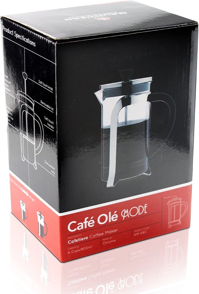 Ένα στιβαρό, επιχρωμιωμένο σώμα από ανοξείδωτο ατσάλι περιβάλλει την κούπα από βοριοπυριτικό γυαλί της Café Olé Mode Cafetière, προσδίδοντάς της στιλβωμένη, κομψή εμφάνιση καθώς και στιβαρό σχεδιασμό.Αυτή η καφετιέρα όχι μόνο προσθέτει μια πινελιά φινέτσας στην κουζίνα σας, αλλά και φτιάχνει ένα απολαυστικά απαλό φλιτζάνι καφέ χάρη στο εξαιρετικά λεπτό φίλτρο κόσκινου, επίσης κατασκευασμένο από υψηλής ποιότητας ανοξείδωτο ατσάλι.Με λαβή και κουμπί με αντοχή στη θερμοκρασία για ασφαλές και άνετο σερβίρισμα του καφέ σας.Με ανθεκτικό φίλτρο από ανοξείδωτο ατσάλι!Ασφαλές για καθάρισμα στο πλυντήριο πιάτων, αλλά συνιστάται το πλύσιμο στο χέρι για τη βέλτιστη διατήρηση της ποιότητας. Η καφετιέρα Café Olé Mode έχει χωρητικότητα έως 8 φλιτζάνια (1 λίτρο).