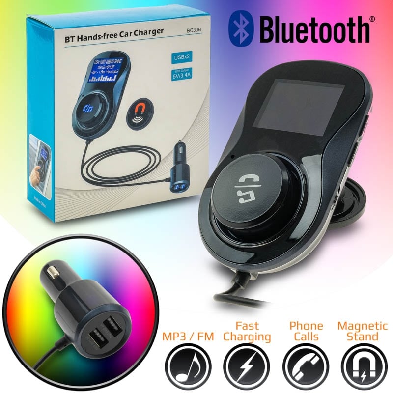 Car Kit Αυτοκινήτου και Φορτιστής BC30B Μία πρωτοποριακή συσκευή που σας επιτρέπει να μεταδώσετε την μουσική σας από το κινητό σας στο στερεοφωνικό του αυτοκινήτου σας μεσώ Bluetooth. Ένα κουμπί πολλαπλών λειτουργιών και οθόνη LCD 1.4" σας χαρίζουν ευκολία στην χρήση.Επίσης υποστηρίζει την ανοιχτή συνομιλία μέσω του ενσωματωμένου μικροφώνου που διαθέτει.Λειτουργία πρωτοκόλλου CVC που απομονώνει τους περιφερειακούς ήχους κατά την συνομιλία. Υποστήριξη FM και κάρτας TF για αναπαραγωγή MP3.Διατηρεί αυτόματα η σειρά των τραγουδιών κατά την απενεργοποίηση του.Διαθέτει 2 θύρες USB που σας εξασφαλίζουν την γρήγορη και ασφαλή φόρτιση των συσκευών σας. Λειτουργεί μέσω του αναπτήρα του αυτοκινήτου σας DC12~24V.Στηρίζετε μαγνητικά με κλιπ από την υποδοχή κλιματισμού. Χαρακτηριστικά: Υλικό: ABS Οθόνη LCD 1.4" Bluetooth Version: 4.1 + EDR Πρωτόκολλα Bluetooth: HFP1.6 / HSPV1.2 / A2DP1.3 / AVCTP1.4 / AVDTP1.3 / AVRCP1.5 Απόσταση Λειτουργίας: 10m Εύρος συχνοτήτων εκπομπών FM: 87,5-108MHZ Υποδοχή κάρτας SD έως 32GB Υποστήριξη αρχείων MP3/WMA Τάση Λειτουργίας: DC 12-24V Τάση Εξόδου: 5V,1A / 5V,2.4A Ανιχνευτής ηλεκτρικής τάσης συχνότητας Ακρίβεια της ένδειξης τάσης μπαταρίας: ± 1V Αντοχή ρεύματος φορτίου: ± 0,1A Αναλογία σήματος προς θόρυβο: >60dB Παραμόρφωση:
