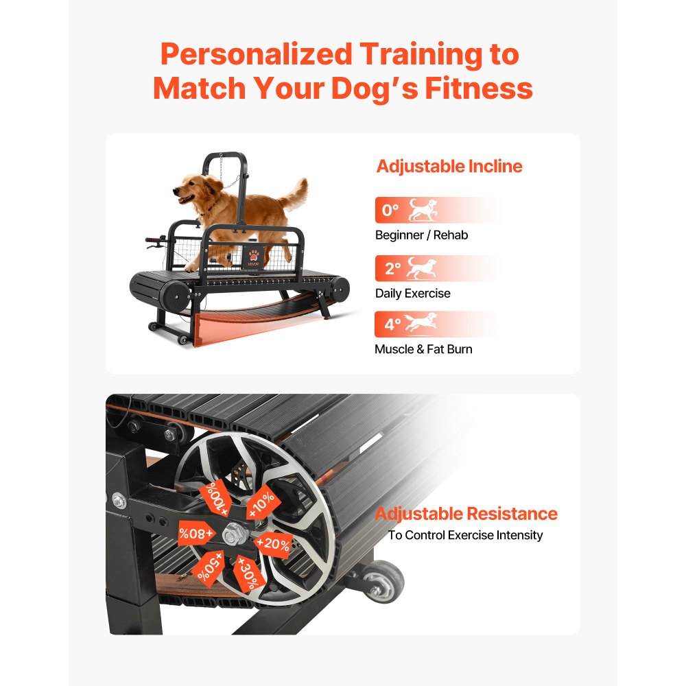 Ασφαλής άσκηση για ενεργό τρόπο ζωής: Αυτός ο μη μηχανοκίνητος διάδρομος για σκύλους επιτρέπει στον σκύλο σας να κινεί μόνος του τον ιμάντα, προσφέροντας μια άνετη άσκηση που βοηθά στην καύση λίπους, στην ανάπτυξη μυών και στην υποστήριξη της πνευματικής διέγερσης. Καθοδηγήστε τον σκύλο σας με λιχουδιές κατά την πρώτη χρήση. Ιδανικό για μικρές και μεσαίες ράτσες: Με μέγιστο φορτίο 440 λίβρες/199,58 κιλά, αυτός ο διάδρομος για σκύλους είναι κατάλληλος για Shiba Inu, Golden Retriever, Labrador Retriever, French Bulldog, Border Collie και άλλα. Κατασκευασμένο για να αντέχει: Κατασκευασμένο με ισχυρό πλαίσιο από ανθρακούχο χάλυβα, ελαστικό πλαστικό ιμάντα τρεξίματος, αλουμινένιους κυλίνδρους και χειροκίνητο φρένο, αυτός ο διάδρομος για σκύλους μεσαίου μεγέθους προσφέρει σταθερή απόδοση και μια πιο ασφαλή εμπειρία εκπαίδευσης για το κατοικίδιό σας. Εύκολη ρύθμιση και εξατομίκευση: Η επάνω μπάρα λουριού, η εγκάρσια μπάρα, το ύψος των ποδιών, η κλίση και η αντίσταση είναι όλα ρυθμιζόμενα, καθιστώντας αυτό το μηχάνημα τρεξίματος σκύλων εύκολο στην προσαρμογή για διαφορετικά σκυλιά και επίπεδα εκπαίδευσης. Η έλλειψη κινητήρων σημαίνει λιγότερη συντήρηση και πιο αθόρυβη χρήση. Εκπαίδευση σε εσωτερικό χώρο οποιαδήποτε στιγμή: Ανεξάρτητα από τον καιρό ή το πρόγραμμα, αυτός ο διάδρομος για σκύλους επιτρέπει την άσκηση σε εσωτερικό χώρο στο σπίτι. Δύο ενσωματωμένοι τροχοί διευκολύνουν την κίνηση και είναι βολικοί για ηλικιωμένους ή πολυάσχολους ιδιοκτήτες.