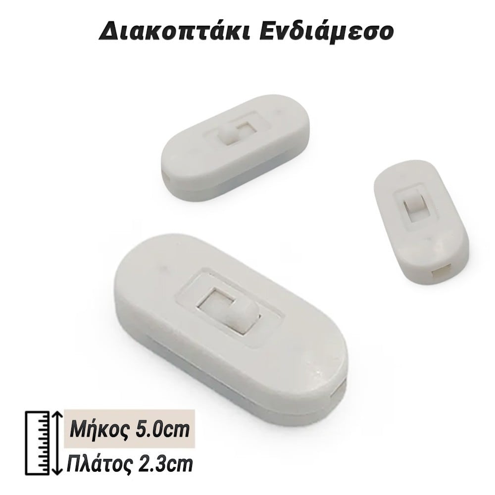 Διακοπτάκι Ενδιάμεσο – Πρακτική Λύση για Άνετο Έλεγχο Ρεύματος Το ενδιάμεσο διακοπτάκι είναι η ιδανική λύση για εύκολο και γρήγορο έλεγχο της τροφοδοσίας σε φωτιστικά, συσκευές και άλλες ηλεκτρονικές εφαρμογές. Σχεδιασμένο για απλή εγκατάσταση, τοποθετείται εύκολα στο καλώδιο και σας επιτρέπει να ενεργοποιείτε ή να απενεργοποιείτε τη συσκευή σας με μία μόνο κίνηση. Χαρακτηριστικά: ✔ Εύκολη σύνδεση ✔ Υψηλή αντοχή ✔ Απλός σχεδιασμός ✔ Εφαρμογές✔ Διαστάσεις Ιδανικό για φωτιστικά, λάμπες, επιτραπέζια φωτιστικά και μικροσυσκευές.