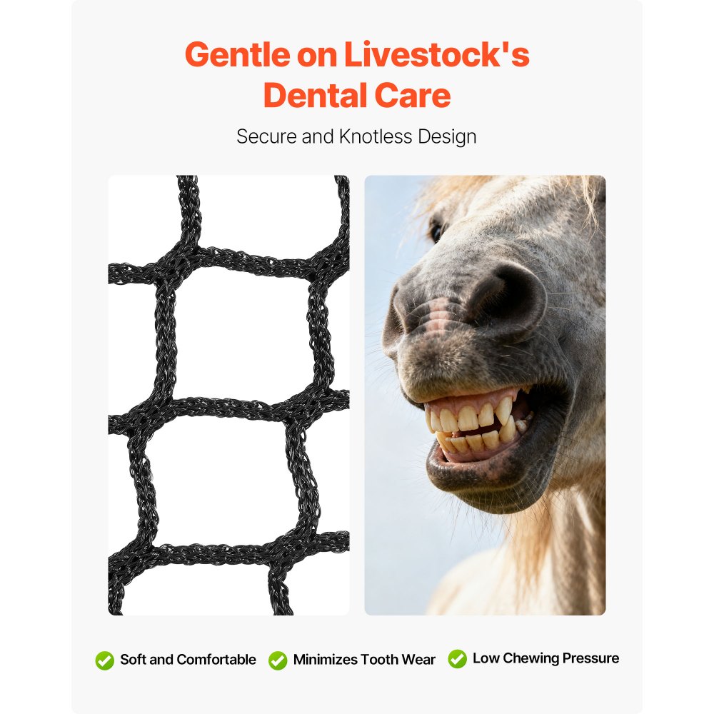 Μεγάλη χωρητικότητα: Με διαστάσεις 5,91 x 5,91 x 5,91 πόδια, αυτό το δίχτυ συλλογής σανού με στρογγυλές μπάλες χωράει 1800-2200 λίβρες σανού, συμπεριλαμβανομένων των μπαλών μηδικής και timothy. Το ευρύ άνοιγμα επιτρέπει το εύκολο γέμισμα και οι ρυθμιζόμενοι ιμάντες ασφαλίζουν την τροφή, εξασφαλίζοντας αποτελεσματική σίτιση για τα ζώα. Ανθεκτικό & Δυνατό: Υφασμένο από υλικό PE υψηλής ποιότητας πάχους 0,2 ίντσας, αυτό το στρογγυλό δίχτυ δεμάτων προσφέρει εξαιρετική ανθεκτικότητα και αντοχή στη φθορά, διατηρώντας το σχήμα και την ακεραιότητα με την πάροδο του χρόνου, ενώ παράλληλα συγκρατεί με ασφάλεια τα δέματα για αξιόπιστη τροφοδοσία. Επιστημονική Αργή Τάισμα: Με μέγεθος ματιού 1,5 ίντσας, αυτό το δίχτυ αργής τροφοδοσίας για στρογγυλά δέματα σανού μιμείται τη φυσική βόσκηση, επιβραδύνει το φαγητό, αποφεύγει την υπερκατανάλωση τροφής και μειώνει τον κίνδυνο φουσκώματος ή ελκών, υποστηρίζοντας τη βέλτιστη πέψη για τα άλογα. Μείωση των αποβλήτων τροφής: Το πλέγμα για τις μπάλες σανού περιορίζει τις διαρροές και το πεσμένο σανό, διατηρώντας την τροφή φρέσκια και καθαρή. Ελαχιστοποιεί τα απόβλητα και εξοικονομεί κόστος, διατηρώντας παράλληλα έναν τακτοποιημένο και καθαρό χώρο σίτισης για τα άλογά σας. Χωρίς κόμπους και ασφάλεια: Αυτό το δίχτυ σανού για στρογγυλά δέματα υιοθετεί σχεδιασμό χωρίς κόμπους για τη μείωση της φθοράς των δοντιών για οδοντιατρική φροντίδα, εξασφαλίζοντας ασφαλή και άνετη σίτιση. Ελαχιστοποιεί τον κίνδυνο τραυματισμού και επιτρέπει στα άλογα να τρώνε φυσικά χωρίς να μπλέκονται.