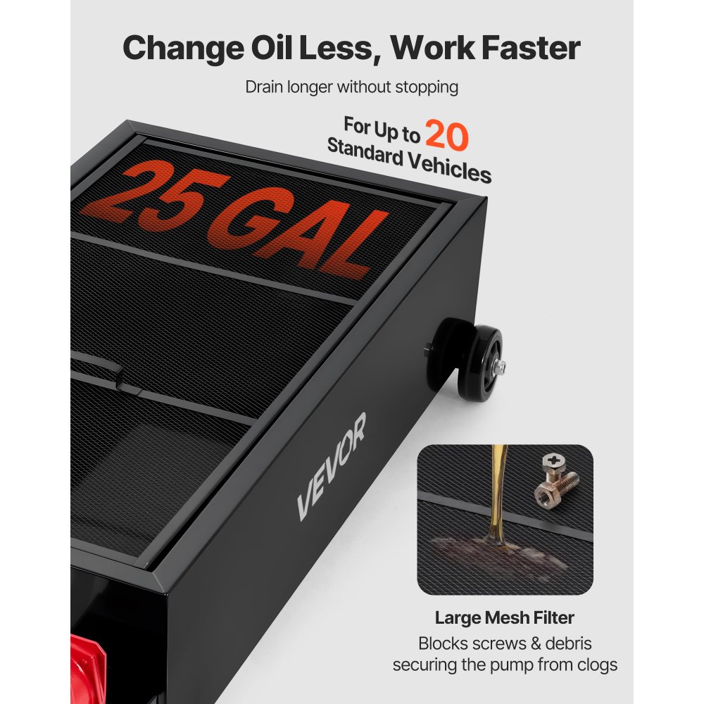 Αποδοτική Αποστράγγιση Λαδιού: Αυτή η χαμηλού προφίλ λεκάνη αποστράγγισης λαδιού διαθέτει χειροκίνητη αντλία, δεν χρειάζεται ρεύμα! Η στιβαρή κατασκευή της την καθιστά αξιόπιστη σε εξωτερικούς χώρους ή σε χώρους χωρίς ηλεκτρικό ρεύμα, όπως αγροκτήματα ή φορτηγά εξυπηρέτησης, δίνοντάς σας πλήρη έλεγχο κάθε φορά. Μεγάλη χωρητικότητα 25 γαλονιών: Η λεκάνη αποστράγγισης λαδιού 25 γαλονιών αποθηκεύει λάδι από πολλά οχήματα ταυτόχρονα. Ένας εύκαμπτος σωλήνας 2,2 μέτρων παρέχει ομαλή και σταθερή αποστράγγιση, καθιστώντας την ιδανική για καταστήματα, αγροκτήματα και πολύωρες εργασίες. Σχεδιασμός χαμηλού προφίλ: Ο εξαιρετικά χαμηλός σχεδιασμός του κυλιόμενου δοχείου αποστράγγισης λαδιού χωράει εύκολα κάτω από χαμηλά αυτοκίνητα, μοτοσικλέτες και ATV χωρίς τη χρήση γρύλου. Μπορείτε να ξεκινήσετε γρήγορα την αποστράγγιση, ακόμη και σε στενούς χώρους. Εύκολη μετακίνηση πλήρους εμβέλειας: Τέσσερις τροχοί, συμπεριλαμβανομένων δύο περιστρεφόμενων τροχών 3 ιντσών με φρένα και δύο σταθερών τροχών 4 ιντσών, κάνουν το καρότσι αποστράγγισης λαδιού μας ομαλό στην κύλιση όταν είναι γεμάτο. Μια πτυσσόμενη λαβή σε σχήμα Τ προσθέτει ευέλικτο σύστημα διεύθυνσης. Ανθεκτική κατασκευή από ατσάλι: Το ενισχυμένο σώμα από ανθρακούχο χάλυβα αντέχει εύκολα στη θερμότητα και την έντονη χρήση. Ένα μεγάλο φίλτρο πλέγματος της φορητής λεκάνης αποστράγγισης λαδιού μπλοκάρει τα υπολείμματα, ασφαλίζοντας την αντλία και βοηθώντας στην παράταση της διάρκειας ζωής της.