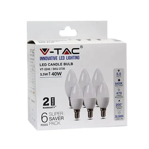 Διατίθεται σε πρακτική συσκευασία Box 6 τεμαχίων, προσφέροντας μια ολοκληρωμένη λύση για την άμεση αντικατάσταση πολλαπλών σημείων φωτισμού σε πολυελαίους, απλίκες και επιτραπέζιες λάμπες. Με την κλασική βάση E14, η τοποθέτηση είναι γρήγορη και απλή. Η V-TAC εγγυάται την ποιότητα και την ασφάλεια του προϊόντος προσφέροντας 2 χρόνια εγγύηση, διασφαλίζοντας μια αξιόπιστη λύση φωτισμού για κάθε εσωτερικό περιβάλλον.