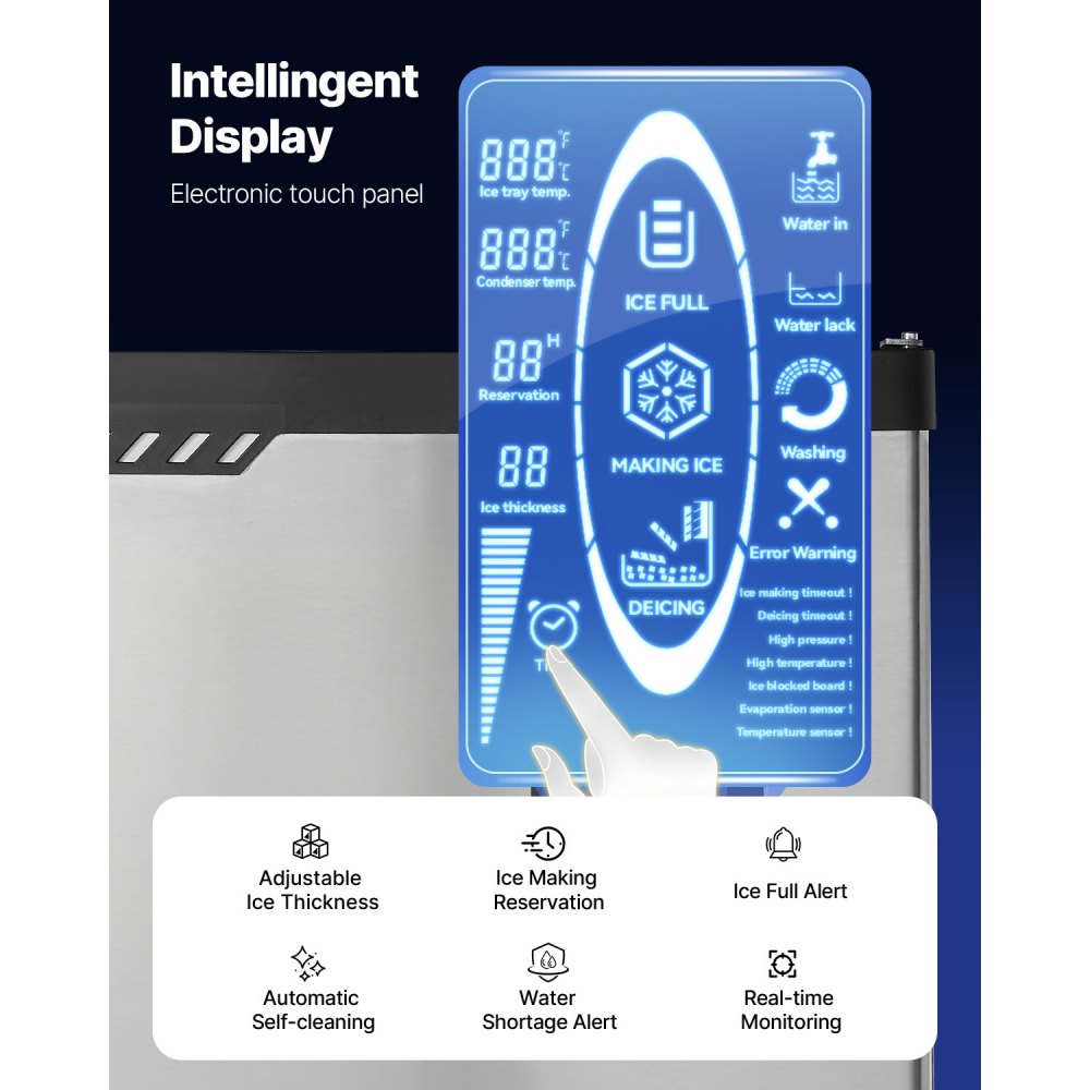 Μεγάλη Παραγωγή Πάγου: Αυτή η επαγγελματική παγομηχανή μπορεί να παράγει 136 κιλά πάγου ανά 24 ώρες, με μεγάλη χωρητικότητα 136 κιλών και εξαιρετική μόνωση, εξασφαλίζοντας συνεχή παροχή πάγου. Γρήγορη Παρασκευή Πάγου: Εξοπλισμένη με 132 δίσκους πάγου, η παγομηχανή σάς επιτρέπει να ρυθμίζετε το πάχος του πάγου αλλάζοντας τον χρόνο παρασκευής πάγου. Ο ισχυρός συμπιεστής μπορεί να παράγει πάγο μέσα σε 12-15 λεπτά. Εύκολος καθαρισμός: Η επαγγελματική μηχανή παρασκευής πάγου διαθέτει λειτουργία αυτοκαθαρισμού με ένα άγγιγμα, παρέχοντάς σας ένα καθαρό και υγιεινό περιβάλλον παραγωγής πάγου και διασφαλίζοντας ότι οι κύβοι πάγου είναι καθαροί. Ισχυρή μόνωση: Αυτή η μηχανή παραγωγής πάγου διαθέτει μονωτικό βαμβάκι και γαλβανισμένο περίβλημα από φύλλο, το οποίο απομονώνει αποτελεσματικά την εξωτερική θερμότητα. Διατηρήστε τα παγάκια σας δροσερά για 6-8 ώρες ακόμη και σε περίπτωση διακοπής ρεύματος. Απολαύστε φρέσκα δροσερά ποτά όλη την ημέρα. Έξυπνος Πίνακας Ελέγχου: Η έξυπνη οθόνη αφής σάς επιτρέπει να ρυθμίζετε εύκολα το πάχος του πάγου και να ενεργοποιείτε τη λειτουργία αυτοκαθαρισμού. Οι ενδεικτικές λυχνίες στον πίνακα παρέχουν ενημερώσεις κατάστασης της παγομηχανής σε πραγματικό χρόνο.
