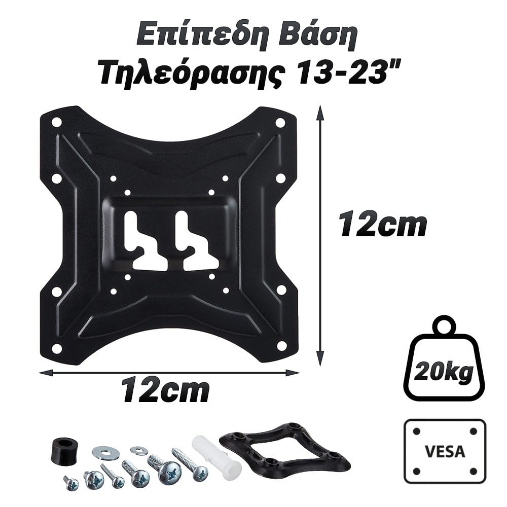 Η Επίπεδη Βάση Τηλεόρασης για συσκευές 13-23 ιντσών είναι κατάλληλη για όλους τους τύπους τηλεοράσεων πλάσμα ή LCD.Έχει χαμηλό προφίλ 1.5cm που σας επιτρέπει να τοποθετήσετε την τηλεόρασή σας πολύ κοντά στον τοίχο.Με εύκολη εγκατάσταση με ολίσθηση μπορείτε να είστε σίγουροι ότι το στήριγμα τοίχου θα συγκρατήσει την τηλεόρασή σας με μέγιστο βάρος 20 kgΌλα τα στηρίγματα συμμορφώνονται με τα πρότυπα VESA που ορίζουν ένα βιομηχανικά ομοιόμορφο σχέδιο οπών στο πίσω μέρος μιας τηλεόρασης ή οθόνης για τη στερέωση - το σχέδιο οπών VESA για αυτό το στήριγμα έχει διαστάσεις 75 x 75 & 100 x 100 mm