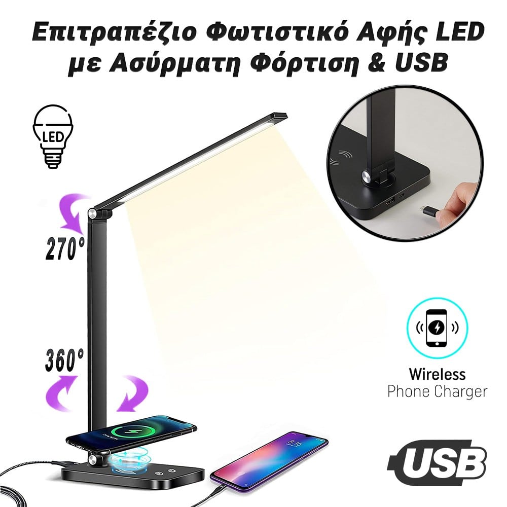Αναβαθμίστε τον χώρο σας με το κομψό και πολυλειτουργικό Επιτραπέζιο Φωτιστικό Αφής LED με Ασύρματη Φόρτιση & USB. Αυτό το μοντέρνο φωτιστικό προσφέρει όχι μόνο φωτισμό υψηλής ποιότητας, αλλά και πρακτικές λύσεις φόρτισης για όλες τις συσκευές σας. Χαρακτηριστικά: Εύκολη ρύθμιση φωτεινότητας μέσω αφής, με δυνατότητα επιλογής διαφορετικών επιπέδων φωτισμού, ιδανικό για διάβασμα, χαλάρωση ή εργασία. Φορτίστε το smartphone σας ή άλλες συμβατές συσκευές απλά τοποθετώντας τις στη βάση του φωτιστικού. Πρόσθετη θύρα USB για γρήγορη και ασφαλή φόρτιση άλλων συσκευών, όπως tablet, power bank ή ακουστικά. Προσφέρει φωτισμό υψηλής απόδοσης με χαμηλή κατανάλωση ενέργειας, συμβάλλοντας στη μείωση του λογαριασμού ρεύματος. Με μίνιμαλ σχεδιασμό, ταιριάζει απόλυτα σε κάθε μοντέρνο ή κλασικό περιβάλλον, είτε στο γραφείο είτε στο σπίτι. Ρυθμιζόμενη κεφαλή για να κατευθύνετε το φως εκεί που το χρειάζεστε περισσότερο. Το Επιτραπέζιο Φωτιστικό Αφής LED με Ασύρματη Φόρτιση & USB συνδυάζει τεχνολογία, λειτουργικότητα και στυλ, κάνοντάς το ιδανικό για κάθε χώρο εργασίας ή ανάπαυσης. Αποκτήστε ένα πρακτικό και καλαίσθητο φωτιστικό που καλύπτει όλες τις ανάγκες σας!