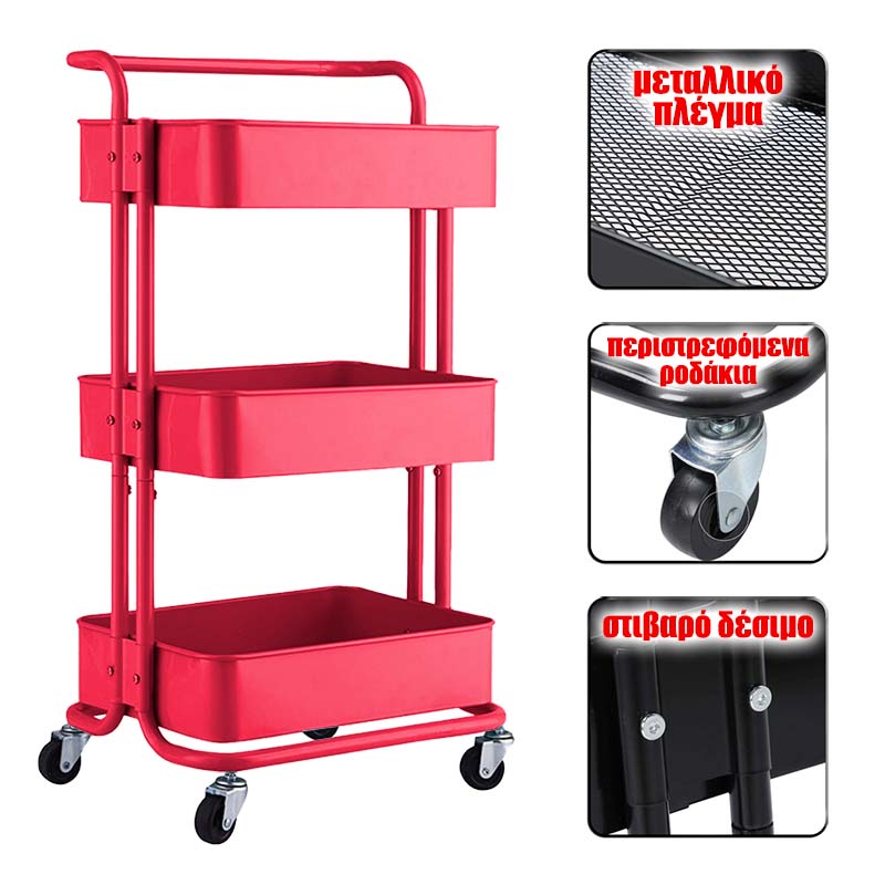 ΜΕ ΡΟΔΕΣ ΚΥΛΙΣΗΣ ΚΑΙ ΧΕΡΟΥΛΙ ΓΙΑ ΕΥΚΟΛΗ ΜΕΤΑΦΟΡΑΕΠΙΠΛΕΟΝ ΕΚΠΤΩΣΗ ΓΙΑ ΠΟΛΛΑ ΤΕΜΑΧΙΑ ΚΑΤΟΠΙΝ ΣΥΝΝΕΝΟΗΣΗΣ Εργαλειοφορέας τροχήλατος βαρέως τύπου. Εύκολη μεταφορά προϊόντων, εργαλείων, αναλωσίμων μεταξύ σημείων εντός του χώρου εργασίας. Με χερούλι μεταφοράς και μεταλλικό πλέγμα στους πάτους. Εύκολη συναρμολόγηση. Μεγάλη διάρκεια ζωής, εξ' ολοκλήρου κατασκευασμένο από ατσάλι. Διατίθεται σε 3 ή 4 επίπεδα και 12 χρωματισμούς για να ταιριάζει με την αισθητική του χώρου.