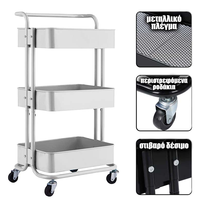 ΜΕ ΡΟΔΕΣ ΚΥΛΙΣΗΣ ΚΑΙ ΧΕΡΟΥΛΙ ΓΙΑ ΕΥΚΟΛΗ ΜΕΤΑΦΟΡΑΕΠΙΠΛΕΟΝ ΕΚΠΤΩΣΗ ΓΙΑ ΠΟΛΛΑ ΤΕΜΑΧΙΑ ΚΑΤΟΠΙΝ ΣΥΝΝΕΝΟΗΣΗΣ Εργαλειοφορέας τροχήλατος βαρέως τύπου. Εύκολη μεταφορά προϊόντων, εργαλείων, αναλωσίμων μεταξύ σημείων εντός του χώρου εργασίας. Με χερούλι μεταφοράς και μεταλλικό πλέγμα στους πάτους. Εύκολη συναρμολόγηση. Μεγάλη διάρκεια ζωής, εξ' ολοκλήρου κατασκευασμένο από ατσάλι. Διατίθεται σε 3 ή 4 επίπεδα και 12 χρωματισμούς για να ταιριάζει με την αισθητική του χώρου.