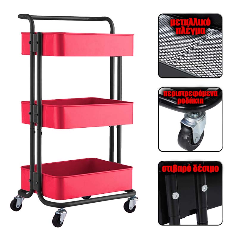ΜΕ ΡΟΔΕΣ ΚΥΛΙΣΗΣ ΚΑΙ ΧΕΡΟΥΛΙ ΓΙΑ ΕΥΚΟΛΗ ΜΕΤΑΦΟΡΑΕΠΙΠΛΕΟΝ ΕΚΠΤΩΣΗ ΓΙΑ ΠΟΛΛΑ ΤΕΜΑΧΙΑ ΚΑΤΟΠΙΝ ΣΥΝΝΕΝΟΗΣΗΣ Εργαλειοφορέας τροχήλατος βαρέως τύπου. Εύκολη μεταφορά προϊόντων, εργαλείων, αναλωσίμων μεταξύ σημείων εντός του χώρου εργασίας. Με χερούλι μεταφοράς και μεταλλικό πλέγμα στους πάτους. Εύκολη συναρμολόγηση. Μεγάλη διάρκεια ζωής, εξ' ολοκλήρου κατασκευασμένο από ατσάλι. Διατίθεται σε 3 ή 4 επίπεδα και 12 χρωματισμούς για να ταιριάζει με την αισθητική του χώρου.