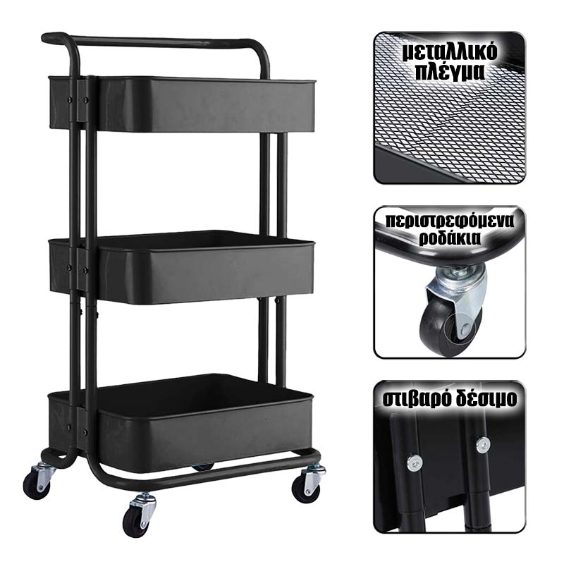 ΜΕ ΡΟΔΕΣ ΚΥΛΙΣΗΣ ΚΑΙ ΧΕΡΟΥΛΙ ΓΙΑ ΕΥΚΟΛΗ ΜΕΤΑΦΟΡΑΕΠΙΠΛΕΟΝ ΕΚΠΤΩΣΗ ΓΙΑ ΠΟΛΛΑ ΤΕΜΑΧΙΑ ΚΑΤΟΠΙΝ ΣΥΝΝΕΝΟΗΣΗΣ Εργαλειοφορέας τροχήλατος βαρέως τύπου. Εύκολη μεταφορά προϊόντων, εργαλείων, αναλωσίμων μεταξύ σημείων εντός του χώρου εργασίας. Με χερούλι μεταφοράς και μεταλλικό πλέγμα στους πάτους. Εύκολη συναρμολόγηση. Μεγάλη διάρκεια ζωής, εξ' ολοκλήρου κατασκευασμένο από ατσάλι. Διατίθεται σε 3 ή 4 επίπεδα και 12 χρωματισμούς για να ταιριάζει με την αισθητική του χώρου.