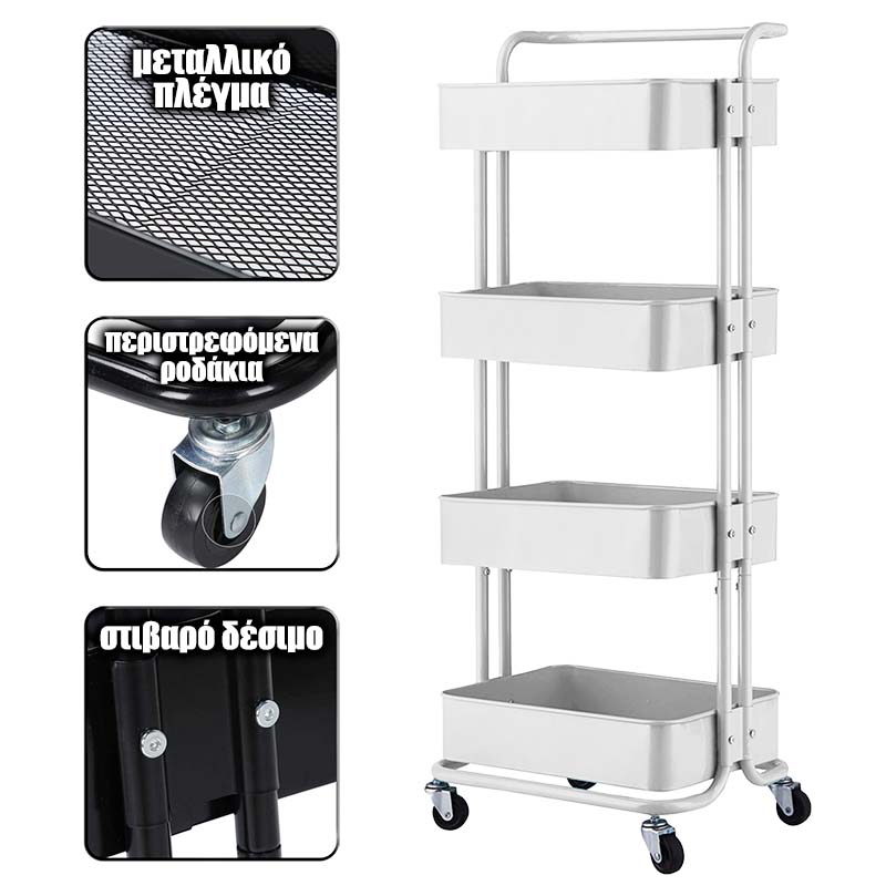 ΜΕ ΡΟΔΕΣ ΚΥΛΙΣΗΣ ΚΑΙ ΧΕΡΟΥΛΙ ΓΙΑ ΕΥΚΟΛΗ ΜΕΤΑΦΟΡΑΕΠΙΠΛΕΟΝ ΕΚΠΤΩΣΗ ΓΙΑ ΠΟΛΛΑ ΤΕΜΑΧΙΑ ΚΑΤΟΠΙΝ ΣΥΝΝΕΝΟΗΣΗΣ Εργαλειοφορέας τροχήλατος βαρέως τύπου. Εύκολη μεταφορά προϊόντων, εργαλείων, αναλωσίμων μεταξύ σημείων εντός του χώρου εργασίας. Με χερούλι μεταφοράς και μεταλλικό πλέγμα στους πάτους. Εύκολη συναρμολόγηση. Μεγάλη διάρκεια ζωής, εξ' ολοκλήρου κατασκευασμένο από ατσάλι. Διατίθεται σε 3 ή 4 επίπεδα και 12 χρωματισμούς για να ταιριάζει με την αισθητική του χώρου.