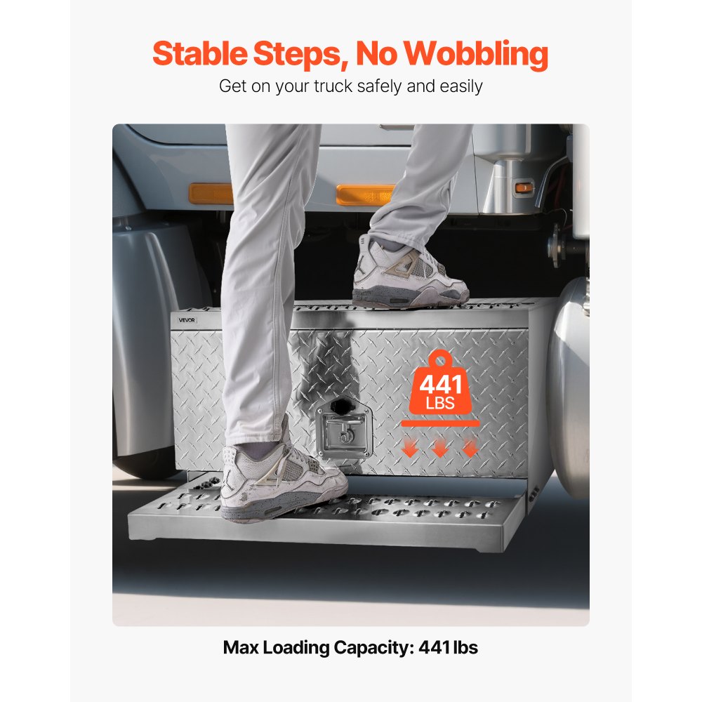 Ανθεκτικότητα σε όλες τις καιρικές συνθήκες: Κατασκευασμένη από κράμα αλουμινίου υψηλής αντοχής, η εργαλειοθήκη VEVOR για ημιφορτηγά προσφέρει εξαιρετική αντοχή στη διάβρωση, την παραμόρφωση, τη σκουριά και τις καιρικές συνθήκες. Ανθεκτική, αδιάβροχη και ανθεκτική για μακροχρόνια χρήση σε εξωτερικούς χώρους. Σταθερά σκαλοπάτια, χωρίς τρεμούλιασμα: Κατασκευασμένη με πλάκες σκαλοπατιών πάχους 2 mm και σώμα εργαλειοθήκης πάχους 3 mm, αυτή η βαριά εργαλειοθήκη αλουμινίου με διαμαντένια πλάκα προσφέρει στιβαρή δομή και αντέχει έως και 200 κιλά, εξασφαλίζοντας ασφαλή και σταθερή είσοδο και έξοδο για τους οδηγούς. Ασφαλής και Αποδοτική Αποθήκευση: Με ένα ευρύχωρο εσωτερικό αποθήκευσης 690 x 475 x 220 mm, κλειδαριά σε σχήμα Τ και 2 κλειδιά, αυτό το κουτί αποθήκευσης σκαλοπατιών συγκρατεί με ασφάλεια κλειδιά, κατσαβίδια, γάντια και άλλα απαραίτητα αντικείμενα, διατηρώντας τα οργανωμένα και εύκολα προσβάσιμα. Ισχυρή αντιολισθητική προστασία: Οι παχιές πλάκες σκαλοπατιών με αντιολισθητικά σχέδια αυξάνουν σημαντικά την πρόσφυση και μειώνουν τον κίνδυνο ολίσθησης. Σε βροχή ή χιόνι, η εργαλειοθήκη σκαλοπατιών εισόδου στην καμπίνα παρέχει μια σταθερή πλατφόρμα για ασφαλέστερη και ευκολότερη είσοδο και έξοδο. Καθολική εφαρμογή: Αυτή η εργαλειοθήκη αποθήκευσης σκαλοπατιών ημιφορτηγού διαστάσεων 760 x 750 x 400 mm είναι συμβατή με ημιφορτηγά, φορτηγά με επίπεδη πλατφόρμα, κινητά φορτηγά εξυπηρέτησης και γερανοφόρα φορτηγά. Ο ενσωματωμένος σχεδιασμός σκαλοπατιών και αποθήκευσης την καθιστά ιδανική αναβάθμιση για το όχημά σας.