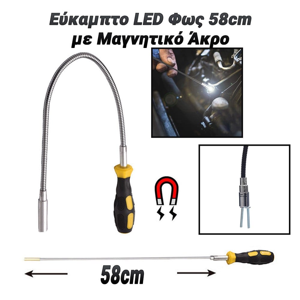 Το Εύκαμπτο LED Φως 58cm με Μαγνητικό Άκρο είναι το απόλυτο εργαλείο φωτισμού για δύσκολα σημεία και λεπτομερείς εργασίες. Με μήκος 58 cm, η εύκαμπτη κατασκευή του σας επιτρέπει να κατευθύνετε το φως ακριβώς εκεί που το χρειάζεστε, ακόμα και σε δυσπρόσιτα σημεία. Το μαγνητικό άκρο εξυπηρετεί στη συλλογή μικρών μεταλλικών αντικειμένων, καθιστώντας το ιδανικό για εργασίες σε συνεργεία, γκαράζ ή στο σπίτι. Χαρακτηριστικά: Μήκος: 58cm για πρόσβαση σε δύσκολα σημεία. LED Φωτισμός: Ισχυρό και αποδοτικό LED για καθαρό φωτισμό. Εύκαμπτη Κατασκευή: Προσαρμόζεται εύκολα για να φωτίζει κάθε γωνιά. Μαγνητικό Άκρο: Ιδανικό για τη συλλογή μικρών μεταλλικών αντικειμένων. Φορητό: Ελαφρύ και εύκολο στη χρήση, κατάλληλο για κάθε εργασία. Το Εύκαμπτο LED Φως με Μαγνητικό Άκρο είναι η ιδανική λύση για επαγγελματίες και χομπίστες που χρειάζονται ακριβή φωτισμό και εργονομικότητα στις καθημερινές τους εργασίες.