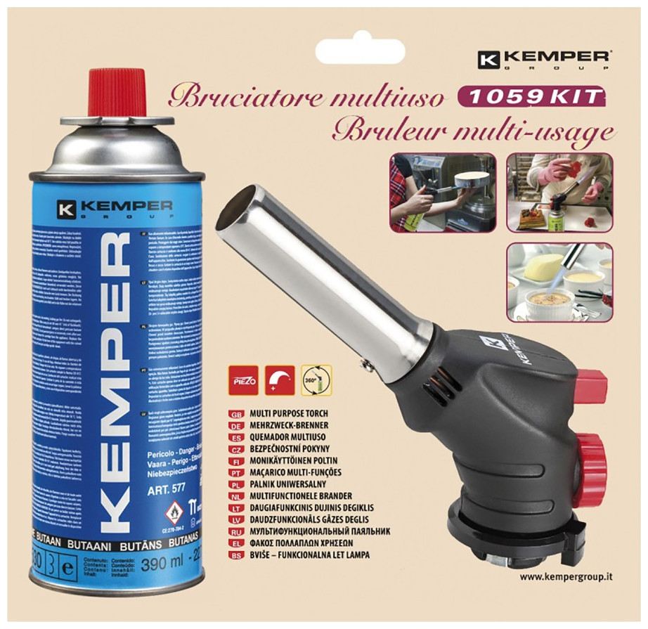 Φλόγιστρο μαγειρικής πολλαπλών χρήσεων με φιάλη υγραερίου (βουτανίου), ιταλικής προέλευσης από την εταιρία KEMPER. Διαθέτει ενσωματωμένη πιεζοηλεκτρική ανάφλεξη και κλειδαριά ασφαλείας. Έχετε την δυνατότητα να ρυθμίζετε τη φλόγα καθώς και να την κλειδώνετε για λόγους ασφαλείας. Ιδανικό για τους λάτρεις της μαγειρικής, κατάλληλο για να καραμελώσετε γλυκά, καφέ και κρέατα.