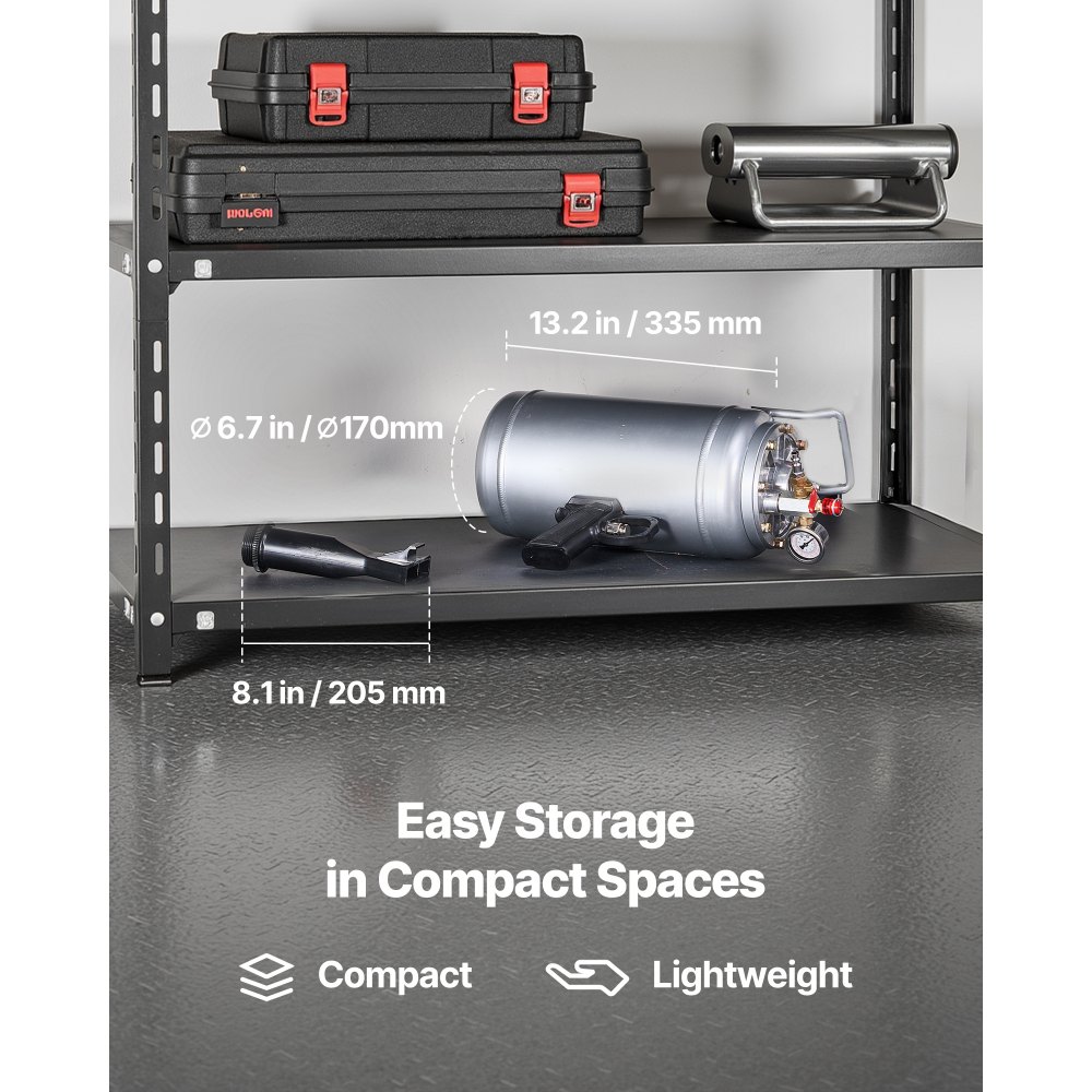 Άμεσο φούσκωμα: Αυτό το σύστημα επαναφοράς χείλους ελαστικού ενισχύει την αποτελεσματικότητα της αλλαγής ελαστικών, εξοικονομώντας χρόνο και προσπάθεια. Απελευθερώνοντας άμεσα αέρα υψηλής πίεσης, ωθεί το χείλος του ελαστικού πίσω στην αυλάκωση της ζάντας, ολοκληρώνοντας τη διαδικασία επαναφοράς του χείλους. Συμβατότητα ελαστικών: Κύλινδρος 1,6 γαλονιών / 6 λίτρων, ταιριάζει σε ελαστικά χωρίς αεροθάλαμο ≤ 19 ίντσες / 482,6 mm. Πίεση λειτουργίας: 87–116 PSI / 0,6–0,8 MPa. Κατάλληλο για αυτοκίνητα, μοτοσικλέτες, SUV, φορτηγάκια, χλοοκοπτικά τρακτέρ και τροχόσπιτα. Εργονομικός σχεδιασμός: Η λαβή τύπου πιστολιού με στιγμιαίο διακόπτη σκανδάλης και η άνω λαβή επιτρέπουν τον ισορροπημένο χειρισμό, μειώνοντας την ανάκρουση στο σώμα σας κατά το φούσκωμα. Να φοράτε πάντα προστατευτικά γυαλιά, ωτοασπίδες και γάντια κατά τη λειτουργία. Χαρακτηριστικά ασφαλείας: Ο κύλινδρος από κράμα αλουμινίου αντιστέκεται στην παραμόρφωση και τις διαρροές κατά τη μακροχρόνια χρήση. Ο εκσφενδονιστής σφαιριδίων είναι εξοπλισμένος με βαλβίδα ασφαλείας που απελευθερώνει αυτόματα την υπερβολική πίεση πέρα από το μέγιστο όριο λειτουργίας. Ο σχεδιασμός με μακρύ λαιμό διατηρεί μια ασφαλή απόσταση. Ελαφρύ & Φορητό: Ο ελαφρύς σχεδιασμός του καθιστά το κάθισμα με χάντρες εύκολο στην ανύψωση χωρίς να καταπονείτε τα χέρια σας. Το μικρό μέγεθος καταλαμβάνει ελάχιστο χώρο, ιδανικό για μεταφορά στο όχημά σας ή αποθήκευση σε εργαστήριο.
