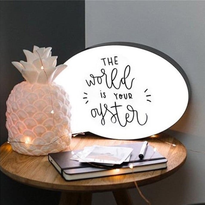 Διακοσμητικός πίνακας φωτισμού για να γράφετε τα δικά σας μηνύματα! Περάστε το μήνυμά σας με τον πιο έξυπνο και πρωτότυπο τρόπο!Είτε πρόκειται για μια απλή υπενθύμιση, είτε για κάποιο γλυκό μήνυμα ή το αγαπημένο σας Motivational Quote το μόνο σίγουρα είναι ότι όλα θα γίνουν πιο λαμπερά με το Φωτείνο Πίνακα Σημειώσεων Light Bubble!Στην μπροστινή επιφάνεια μπορείτε να εκφράσετε τα συναισθήματα και τις σκέψεις σας με μαρκαδόρους πίνακα αμέτρηρες φορές καθώς καθαρίζει πανεύκολα με σφουγγάρι ή βρεγμένο πανί!Στη συσκευασία περιέχονται 2 μαρκαδόροι σε μαύρο και ροζ χρώμα για να ξεκινήσετε αμέσως!Το διακριτικό αλλά πολύ χρήσιμο φως του Φωτεινού Πίνακα Σημειώσεων Light Bubble είναι μια εξαιρετική λύση βοηθητικού φωτισμού σε κάθε χώρο!Διαθέτει 12 ενσωματωμένα Λευκά LED φωτιστικά στοιχεία με χειρισμό από διακόπτη ON/OFF.Τροφοδοσία:6xAA Διαστάσεις: Μήκος:30cm Πλάτος:5cm Ύψος:21cm