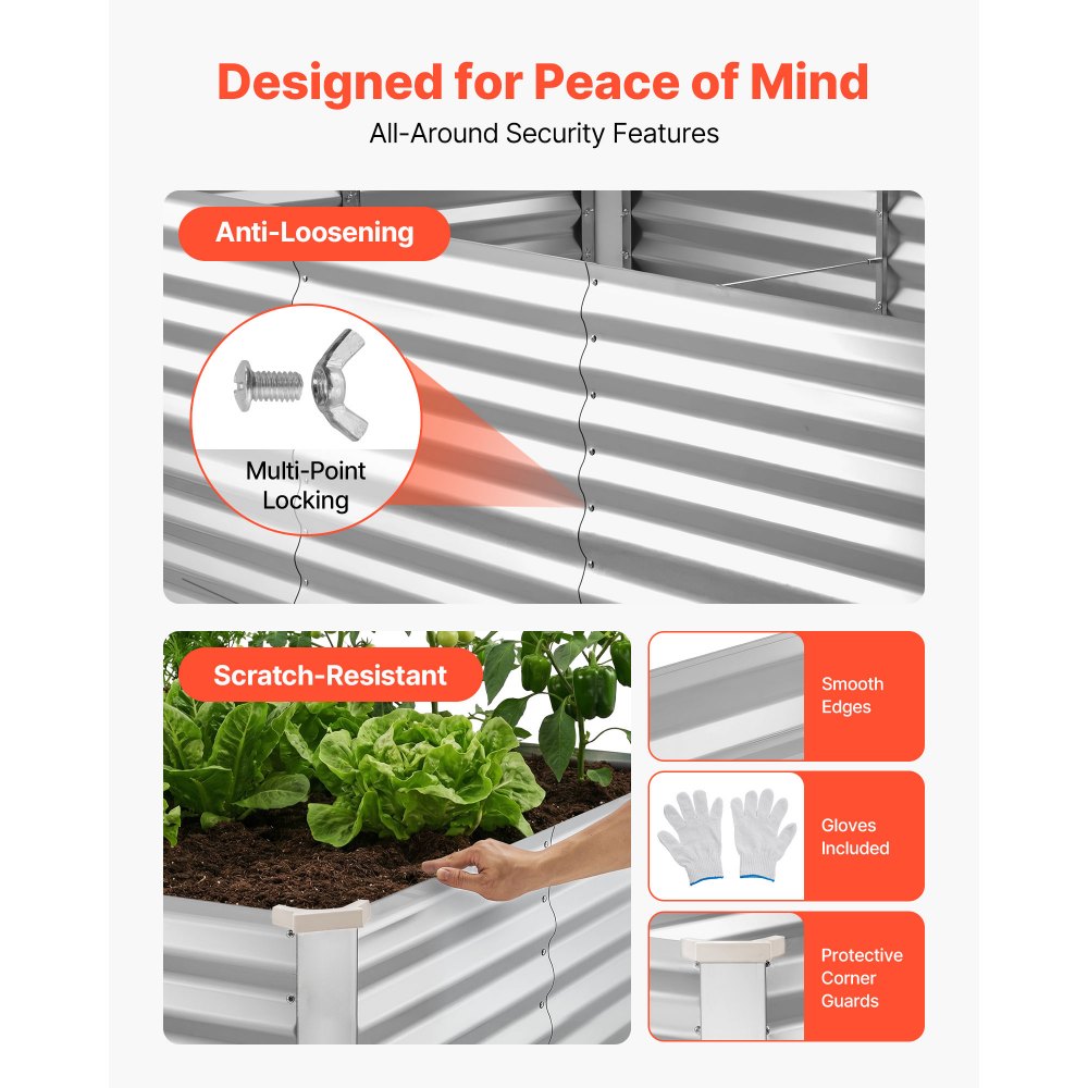Εξαιρετικά μεγάλος χώρος καλλιέργειας: Αυτό το υπερυψωμένο παρτέρι διαθέτει χώρο φύτευσης 2,5 x 1,2 x 1,8 μέτρα, παρέχοντας γενναιόδωρη χωρητικότητα και βάθος εδάφους. Άφθονο χώρο για να εξαπλωθούν οι ρίζες κάθετα και οριζόντια, υποστηρίζοντας την υγιή ανάπτυξη λαχανικών και λουλουδιών. Ενισχυμένη & Σταθερή Δομή: Με παχιά πόδια, κυματοειδή πάνελ και ενισχυτικές ράβδους, αυτό το υπερυψωμένο παρτέρι εξωτερικού χώρου κατανέμει ομοιόμορφα την πίεση του εδάφους. Σχεδιασμένο για να αποφεύγεται η στρέβλωση, παραμένει σταθερό ακόμα και όταν είναι πλήρως φορτωμένο με υγρό χώμα μετά το πότισμα. Σχεδιασμός χωρίς πάτο, γρήγορη αποστράγγιση: Αυτή η γλάστρα διαθέτει σχεδιασμό με ανοιχτό πάτο που επιτρέπει την γρήγορη αποστράγγιση της περίσσειας νερού. Προωθεί την υγιή ανάπτυξη των ριζών και την απορρόφηση θρεπτικών συστατικών και μειώνει τις ανησυχίες για συντήρηση, ακόμη και κατά τη διάρκεια έντονης βροχής ή υπερβολικού ποτίσματος. Ανθεκτικό στη σκουριά και κατασκευασμένο για να διαρκεί: Κατασκευασμένο από ανθεκτικό πάνελ με επικάλυψη αλουμινίου-ψευδαργύρου, αυτό το υπερυψωμένο κουτί κήπου εξωτερικού χώρου αντιστέκεται στη σκουριά, τη διάβρωση και την παραμόρφωση. Σχεδιασμένο για μακροχρόνια χρήση σε εξωτερικούς χώρους, διατηρεί την αντοχή και το σχήμα του σεζόν με τη σεζόν στον κήπο σας. Ασφαλής εμπειρία κηπουρικής: Με πολλαπλά σημεία σύνδεσης και σταθερό πλαίσιο, αυτό το υπερυψωμένο παρτέρι εγκαθίσταται σταθερά χωρίς χαλάρωση. Οι στρογγυλεμένες άκρες, τα προστατευτικά γωνιών και τα γάντια που περιλαμβάνονται βοηθούν στη μείωση του κινδύνου τραυματισμού, καθιστώντας την κηπουρική ασφαλή.