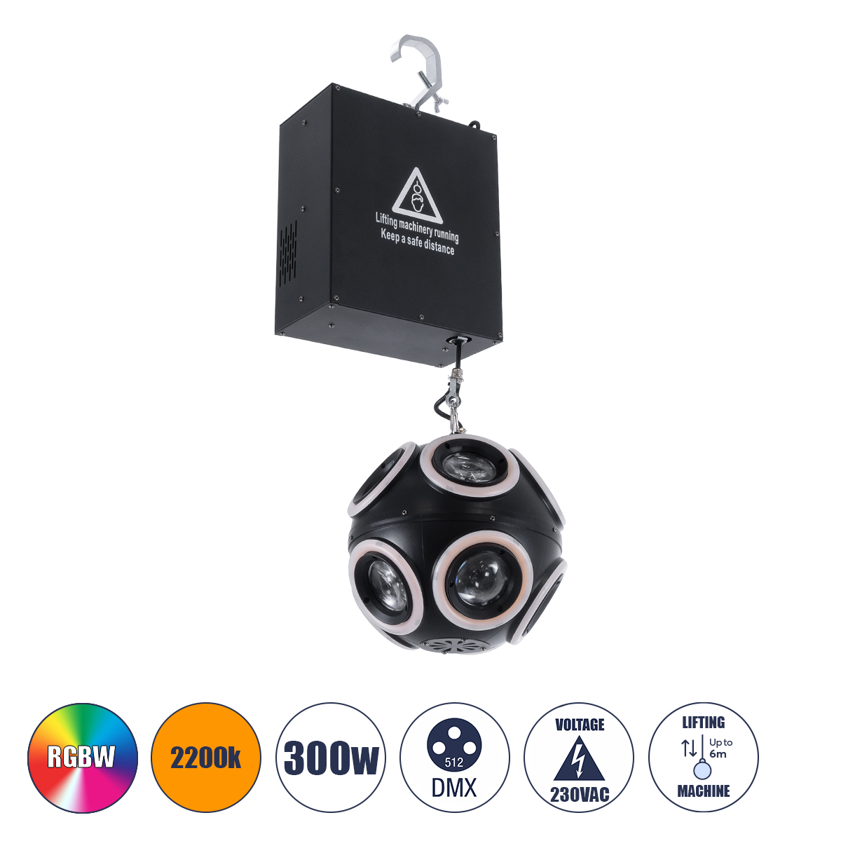 GloboStar® 51197 LIFT BALL Επαγγελματικό Φωτιστικό Ειδικών Εφέ Φ25cm KINETIC BALL MATRIX PIXEL Super BEAM Light CREE LED 4in1 300W - 10 x 20W LED COB Chips RGBW & 10 x 20W LED COB Chips Ultra Gold Warm White 2200K - Μέγιστο Μήκος Ανύψωσης 6 Μέτρα - AC 220